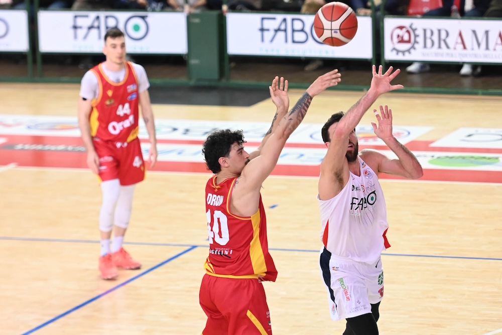 All’inizio dell’ultimo periodo, sul punteggio di 54-61, Montecatini viene trascinata dai soliti Paesano e Chiera (19 punti al termine) che, con le loro realizzazioni, impattano per la prima volta la gara a quota 61, prima della reazione degli uomini di coach Gabrielli, che trovano la risposta al momento di difficoltà nelle due triple segnate da Munari e Ferrari. La formazione toscana non si dà per vinta provando a recuperare ancora una volta il match, mentre i giallorossi provano a stringere le maglie in difesa per chiudere definitivamente la gara. A poco più di sessanta secondi dalla fine l’OraSì si riporta avanti per due volte con le realizzazioni dalla media di Tyrtyshnyk e Dron, ma il canestro e libero supplementare segnato da Dell’Uomo regalano il primo vantaggio dell’incontro ai padroni di casa, quando il cronometro segna venticinque secondi dal termine. Nell’azione successiva il canestro di Brigato (14 punti, 4/4 dal campo) sembra ridare speranza ai bizantini, ma la tripla segnata da Benites e la preghiera sputata dal ferro di Ferrari chiudono definitivamente i giochi, con la gara che termina col punteggio di 76-74.