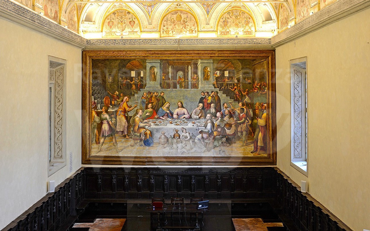 Il monastero di Classe, sede della biblioteca, è da tempo inserito negli itinerari turistici e culturali del territorio per via della sua bellezza e per le molteplici attività che vi si svolgono. La sua antica storia rimanda al 1515, anno in cui i camaldolesi, provenienti da Classe, dove custodivano l’antichissima basilica di Sant’Apollinare, presero a risiedere stabilmente all’interno delle mura cittadine. Ebbe così avvio il lungo cantiere che portò all’edificazione della straordinaria abbazia, comprendente anche lo splendido refettorio costruito nel 1580 e usato a tale scopo fino al 1798, anno della soppressione del monastero e della cacciata dei monaci. Al suo interno possiamo ammirare ancora oggi lo splendido dipinto “Le nozze di Cana” di Luca Longhi e gli affreschi sul soffitto, opera del figlio Francesco, che accolgono visitatori e visitatrici in uno spazio memorabile, arricchito dagli stalli lignei e dal monumentale pergamo settecentesco dal quale un monaco lettore, un tempo, leggeva ai confratelli intenti a prendere i pasti.