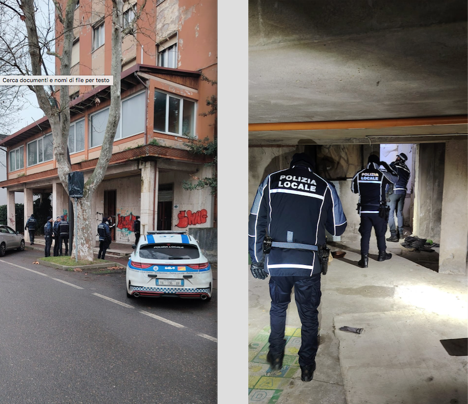 L’intero stabile è stato ispezionato, compresi cantine, locali caldaie e garage; all’interno dell’immobile non sono state rinvenute persone, ma vi erano chiari segni di prolungati bivacchi, con la presenza di materassi, coperte, bottiglie, stoviglie di plastica e residui alimentari. Sono stati inoltre rinvenuti materiali riconducibili al consumo di sostanze stupefacenti, tra cui numerose siringhe e fogli di carta stagnola.