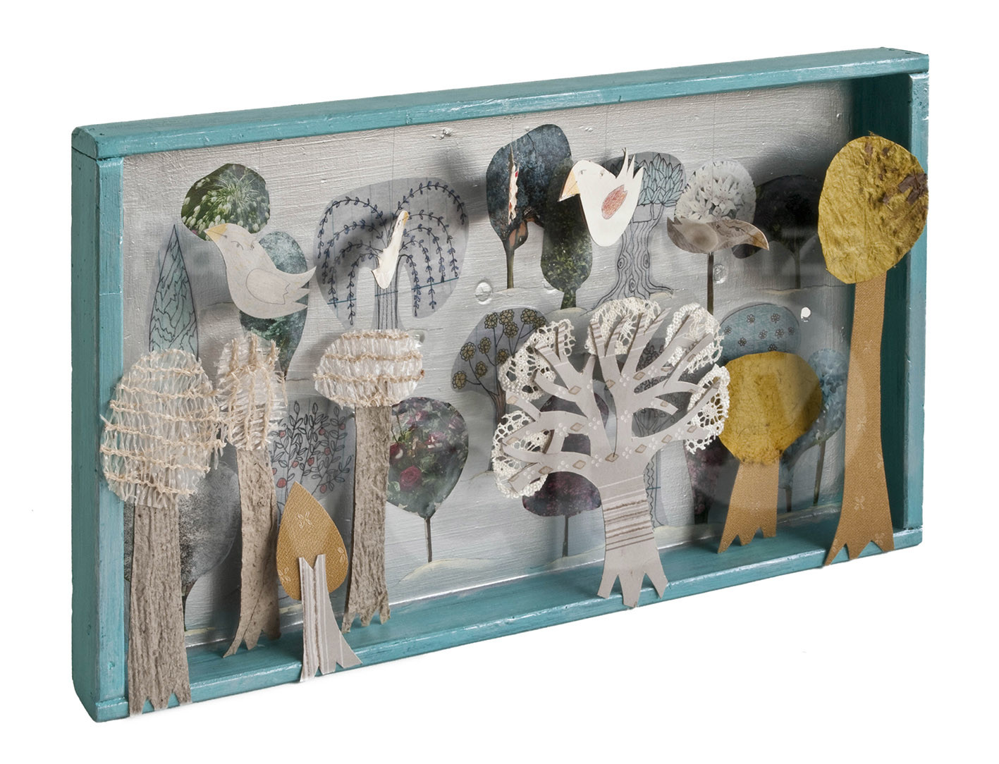 In esposizione ci sono assemblaggi con carte, cartoncini, stoffe, pizzi e imballaggi, realizzati fra il 2008 e il 2012. «Conservo amorevolmente e utilizzo questi materiali – racconta l’artista – che per me hanno una loro peculiare bellezza, ognuno rimanda a una piccola storia. Sono pizzi fatti all’uncinetto da una nonna, un sacchetto delle patate, brandelli di vecchie tappezzerie, carte fatte a mano comprate secoli fa a Urbino, la copertura di un sussidiario degli anni Sessanta, carte per le risguardie acquistate a Genova in viaggio di nozze, campionari di stoffe ricevuti in regalo da una cara amica, ritagli dai cataloghi Bakker che riceveva mia mamma ormai ingialliti dal tempo, pezzi di tettoia in vetroresina rubati tra le carabattole di mio babbo, cartone ondulato da una confezione di merendine, pirottini dell’Ikea…