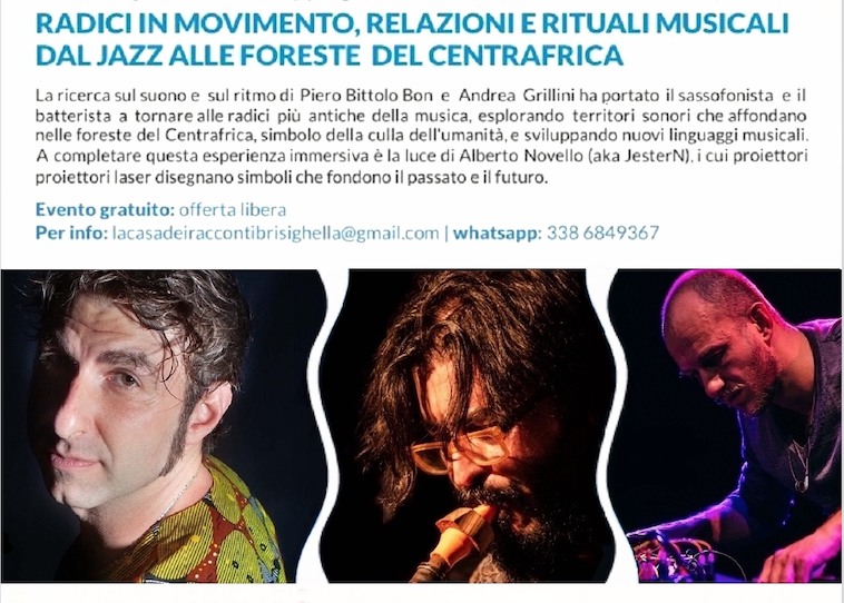 Presentare il progetto Radici in movimento, racconta Andrea Grillini ci ha portato a muoverci dai rituali musicali del jazz fino alle foreste del Centrafica. Sono suoni che continuano ancora a pulsare in profonditร come un gigantesco micelio, inseguendo il suono dei nostri passi sul pianeta ovunque noi andiamo e riemergendo quando meno ce lo si aspetta per ricordarci da dove veniamo.