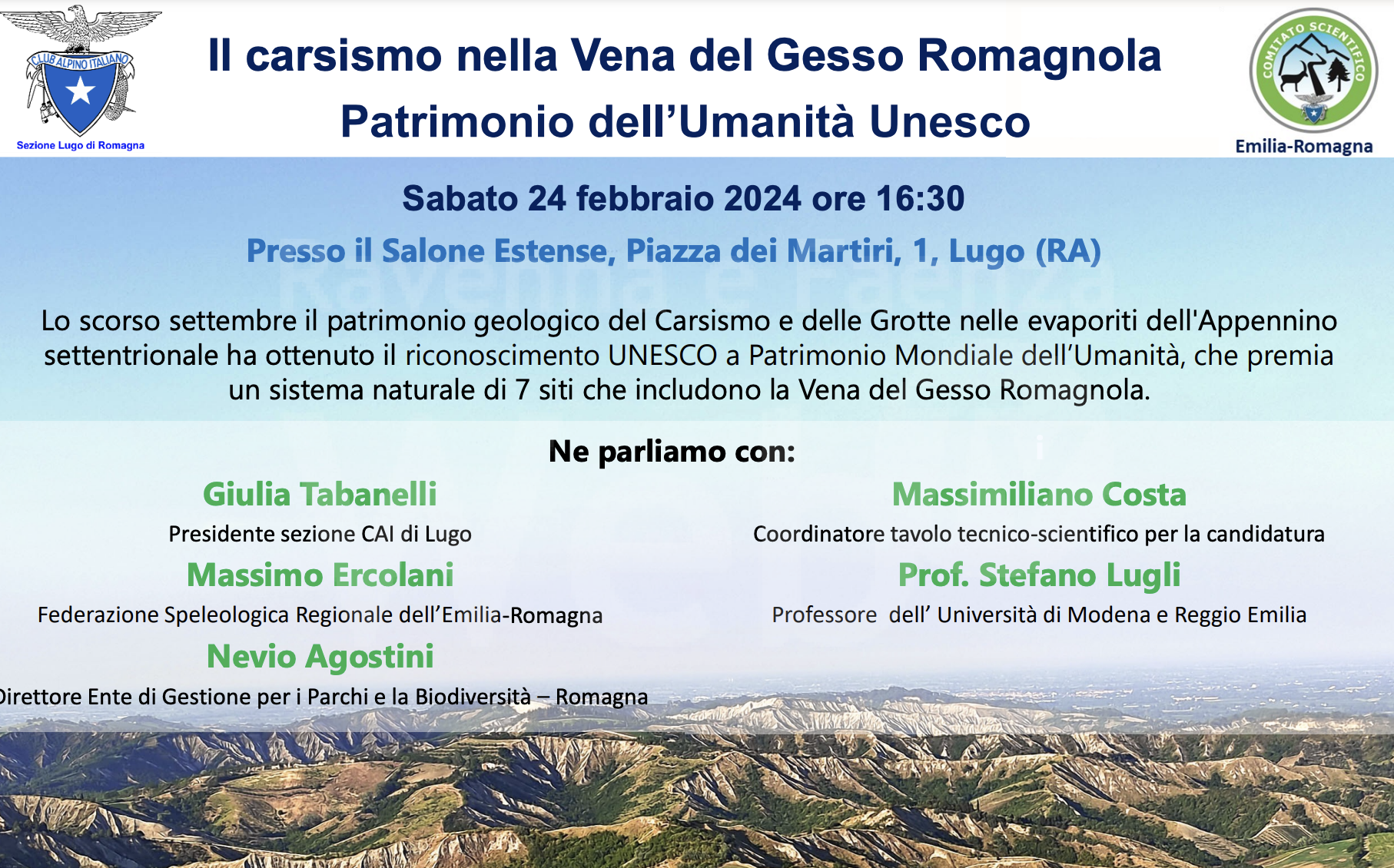 Oltre alla Presidente del Cai di Lugo saranno presenti Massimo Ercolani in rappresentanza della Federazione Speleologica Regionale dell’Emilia Romagna, Nevio Agostini – Direttore dell’Ente di gestione per i parchi e la biodiversità Romagna, Massimiliano Costa – Coordinatore del tavolo tecnico-scientifico per la candidatura Unesco, Stefano Lugli – Professore dell’Università di Modena e Reggio Emilia.