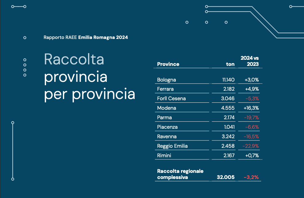 Nel 2024 la regione Emilia Romagna ha raccolto 32.005 tonnellate di rifiuti da apparecchiature elettriche ed elettroniche (RAEE). È quanto emerge dal Rapporto regionale realizzato dal Centro di Coordinamento RAEE, l’organismo che sintetizza i risultati ufficiali conseguiti da tutti i Sistemi Collettivi che si occupano del ritiro presso i centri di raccolta comunali e i luoghi di raggruppamento.