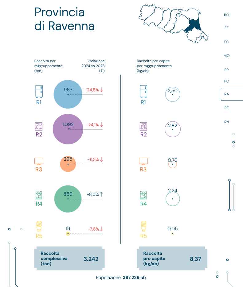 Seconda provincia più virtuosa per raccolta pro capite si conferma Ravenna con 8,37 kg/ab, nonostante una flessione importante rispetto al 2023 (-16,9%). La provincia risulta particolarmente virtuosa nella raccolta di R4 e R1: ogni cittadino raccoglie infatti circa mezzo chilo in più sia di piccoli elettrodomestici sia di frigoriferi rispetto a una media regionale rispettivamente di 1,48 kg/ab e 1,99 kg/ab.