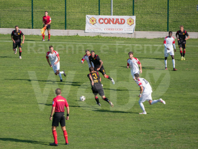 Gara subito in salita per i giallorossi a Correggio, che vanno già sotto al 6ì del primo tempo, Manuzzi dal limite dell’area lascia partire una conclusione che si infila nel sette rendendo vano il tuffo di Botti. Padroni di casa galvanizzati che sfiorano poco dopo il raddoppio con un inserimento di Ba, non preciso al momento di concludere. Il Ravenna non sembra trovare le armi per fare male e ci prova il Calì sponda Correggese a dare un dispiacere al fratello ed a tutti i giallorossi, ma Botti chiude la saracinesca. Il Ravenna prova ad affidarsi al giro palla ed alle sicurezze che hanno portato alla vittoria contro il Lentigione, ed al 21’ trova il pareggio. Corner disegnato da Ambrosini e Saporetti incorna in rete. Ravenna che a questo punto aumenta i giri del motore, ma continua a sbattere su una attenta difesa biancorossa che blocca il risultato sull’1-1 al termine della prima frazione. Il copione si ripete però nella ripresa ed al 7’ i padroni di casa trovano la rete del vantaggio. Cross di Damiano per Lucatti che sbuca sul secondo palo e realizza. Dossena prova a cambiare un po’ le carte in tavola per raddrizzare l’inerzia di una gara che propende sempre di più verso la Correggese inserendo Sylla e Lussignoli. Proprio la punta senegalese si trova la palla del possibile pareggio al 29’, ma la sua incornata sul bel cross di Macrì non trova lo specchio. Il Ravenna è in pressione, ma fatica a rendersi realmente pericoloso. L’ultima emozione allo scadere con il neo entrato Mascanzoni che sfruttando una imprecisione della difesa scappa in profondità, ma il suo tentativo di pallonetto viene controllato da Mora che sigilla il risultato. Passo indietro dei giallorossi che non riescono a mettere in campo la stessa intensità mostrata al Benelli e dovranno necessariamente cambiare marcia nelle prossime uscite, a partire dalla prossima gara interna contro il Sasso Marconi.