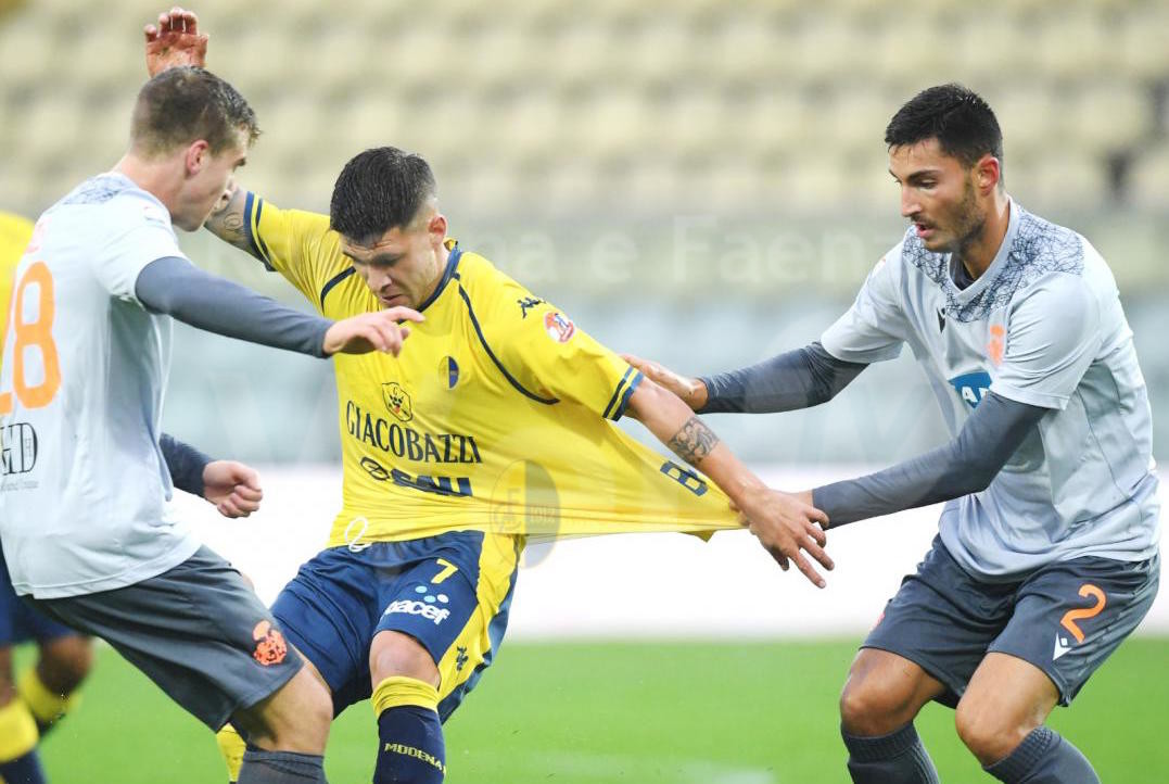Botta e risposta nei primi minuti con un Modena che vuole imprimere i ritmi, ma il primo tiro è di Meli al 5’, cui risponde Scappini in girata, entrambi poco pericolosi. Martignago è pimpante ed al 19’ scappa sulla linea ma il suo appoggio è preda della retroguardia modenese. Di nuovo il 20 giallorosso regala un assist a centro area a Mokulu al 22’, ma la punta sbaglia da posizione molto vantaggiosa. Il Ravenna punge, ed al 29’ passa in vantaggio con Meli dopo una bella serpentina, ma l’arbitro annulla per un presunto fallo di mano. L’antica legge del calcio gol sbagliato, gol subito è anche oggi impietosa, ed i canarini al 34’ passano in vantaggio con una bellissima azione fatta di scambi di prima che porta Spagnoli ad appoggiare in rete sul secondo palo. Il Ravenna allo scadere ha anche l’opportunità del pareggio, ma il tiro di Meli sugli sviluppi di una punizione non centra lo specchio della porta
