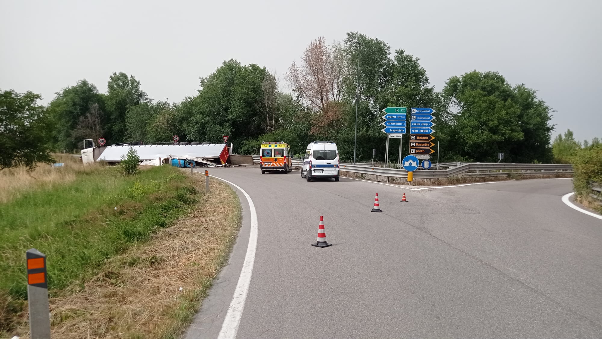 La Polizia Locale di Ravenna – Ufficio Strumentazione Tecnica e Controllo Trasporto Pesante – è intervenuta a supporto dell’Ufficio Infortunistica Stradale in via Canale Magni, all’intersezione con via Degli Spedizionieri, dove un camion aveva appena perso il carico, 5 coils, causando un pericolo per tutti i mezzi in circolazione.