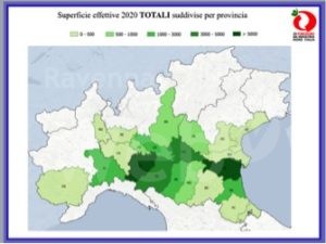 Questa la suddivisione delle superfici effettive nelle province del bacino del Nord Italia: Piacenza 10.025 ettari; Ferrara 6.788; Parma 4.238; Mantova 3.998; Alessandria 2.173; Cremona 2.036; Ravenna 1.988; Reggio Emilia 1.111; Modena 867; Verona 838; Pavia 491; Lodi 526; Brescia 603; Rovigo 436; Bologna 320; Cuneo 217; Milano 138. Seguono altre province con valori molto più contenuti.
