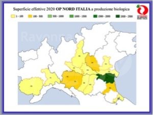 Per le superfici effettive biologiche spicca il dato di Ferrara (2.212 ettari), seguita da Ravenna 416; Parma 247; Verona 173 e Piacenza 120. Poi le altre province con valori più contenuti.
