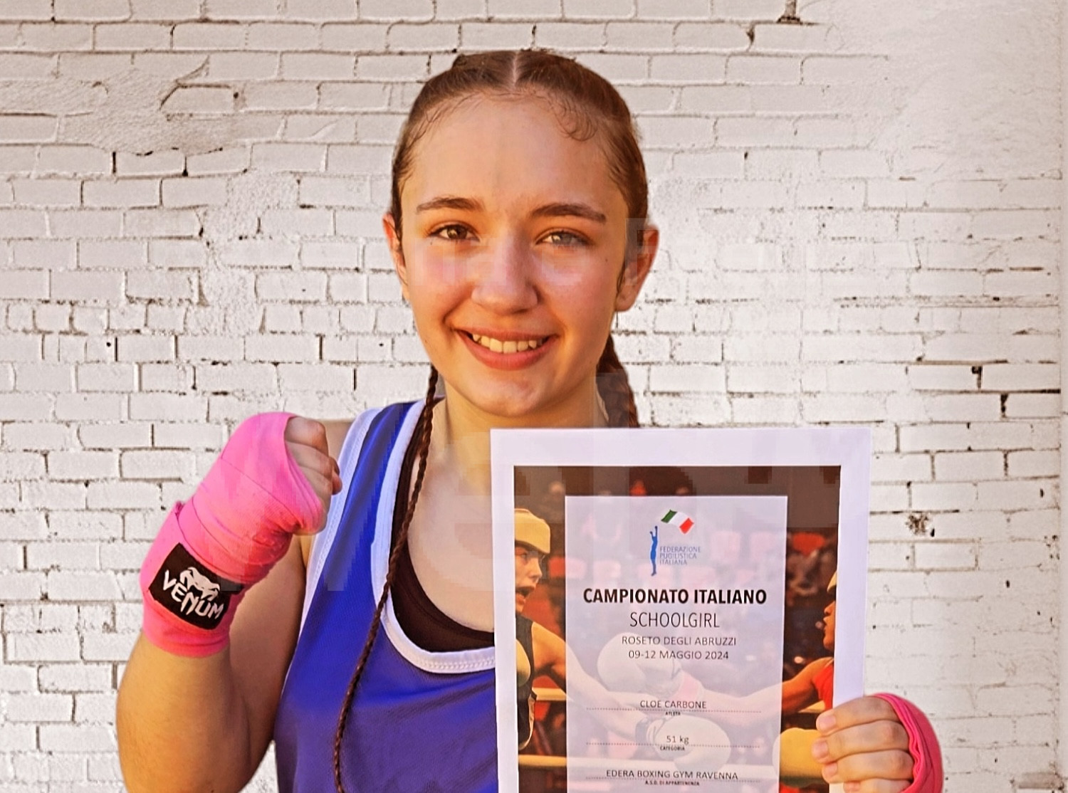 Già dalla prima ripresa Cloe ha dimostrato di avere grinta e coraggio da vendere, non lasciandosi intimidire dalla differenza di statura a vantaggio della sua avversaria. La seconda ripresa è stata intensa e ha visto la giovane pugile ravennate sferrare colpi efficaci, tenendo un ritmo alto e cercando il confronto ravvicinato. Purtroppo però, all’inizio della terza ripresa l’incontro fra le due atlete si è dovuto interrompere a causa di un infortunio al braccio della piccola Cloe, che ha decretato l’inevitabile vittoria avversaria. Termina così la prima indimenticabile esperienza ai Campionati Italiani per Cloe Carbone, che rientra a casa soddisfatta della sua prestazione e pronta per le prossime sfide.