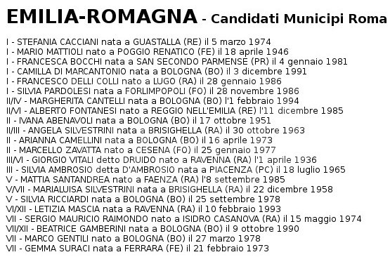 Per il Comune di Roma e per i suoi quindici Municipi corrono candidati nati in tutte le regioni italiane, ad esclusione della Valle d’Aosta. Dominano i meridionali, quasi mille in tutto: il gruppo più nutrito è quello dei 340 campani (110 per il Comune, 230 per i Municipi), seguito da 216 calabresi (62 per il Campidoglio e 154 per i Municipi) e 183 pugliesi (40 e 143). Quindi 126 siciliani (37 e 89), 52 lucani (10 per il Campidoglio) e 16 molisani. Particolarmente presenti anche gli abruzzesi: sono 97 tra Comune e Municipi. I sardi sono 41. Per le altre regioni, 94 sono coloro che sono nati in Lombardia, 82 toscani, 49 emiliano-romagnoli, 40 veneti, 39 marchigiani, 39 umbri, 33 liguri e 22 friulani. Infine quattro in rappresentanza del Trentino-Alto Adige.