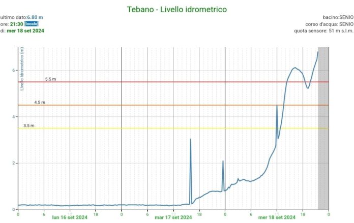 Alle 21.30 il livello del Senio a Tebano ha toccato i 6,80 m. Il sindaco alle 22 di mercoledì sera ha diramato un’allerta a tutta la popolazione: tutti i residenti devono salire ai piani più alti delle loro abitazioni. Nessuno deve scendere in strada o negli scantinati. Nel pomeriggio erano state evacuate alcune case vicino al fiume ed era stato aperto il palazzetto dello sport per accogliere quelle famiglie impossibilitate a raggiungere un livello superiore nelle proprie abitazioni.