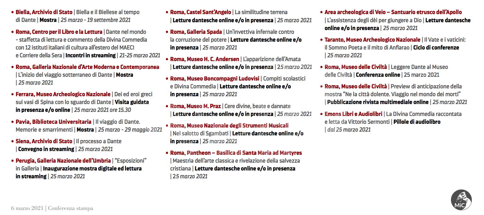 Il 25 marzo torna il Dantedì, l’iniziativa istituita lo scorso anno dalla Presidenza del Consiglio che si ripeterà ogni anno. La cultura e le celebrazioni dantesche non si fermano di fronte alla pandemia. Ma la presentazione degli eventi del Dantedì, che culmineranno con la lettura simbolica della Divina Commedia da parte di Roberto Benigni (al Quirinale e in diretta Rai), quest’anno ha avuto un’importanza ancora maggiore perché ha rappresentato anche l’occasione per illustrare gli eventi delle celebrazioni dantesche per il settimo centenario della morte del Sommo Poeta. Celebrazioni iniziate a Ravenna con l’inaugurazione del restauro della tomba di Dante e la visita del Presidente della Repubblica Sergio Mattarella, la benedizione da parte di Papa Francesco della croce donata da Paolo VI e l’inizio della lettura perpetua di Dante, ogni giorno, davanti alla tomba, anche durante la pandemia. Gli eventi dei prossimi mesi invece saranno l’inaugurazione del Museo Dantesco (programmata per il 25 marzo, ma dipenderà dalle normative legate alla pandemia) e della Casa Dante, le mostre, i convegni, gli spettacoli, in particolare la stagione del Ravenna Festival e la chiamata pubblica per il Paradiso, Elio Germano, Neri Marcorè, le opere musicali, l’inedita composta da Giovanni Sollima, e i concerti diretti da Riccardo Muti.