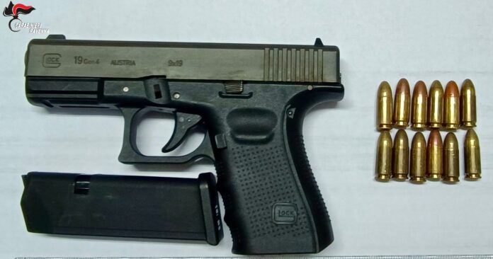 La perquisizione nel domicilio ha portato al rinvenimento di una pistola calibro 9 con matricola abrasa, completa di caricatore con dodici proiettili.