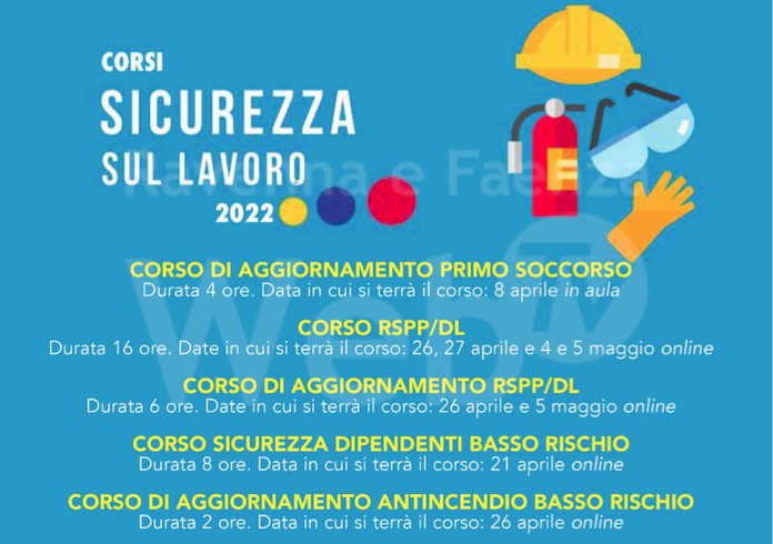 Iscom E.R Ravenna, l’istituto per lo sviluppo del commercio e del turismo, in collaborazione con Confcommercio Ravenna, organizza cinque corsi sulla sicurezza sul lavoro a partire dall’8 aprile.