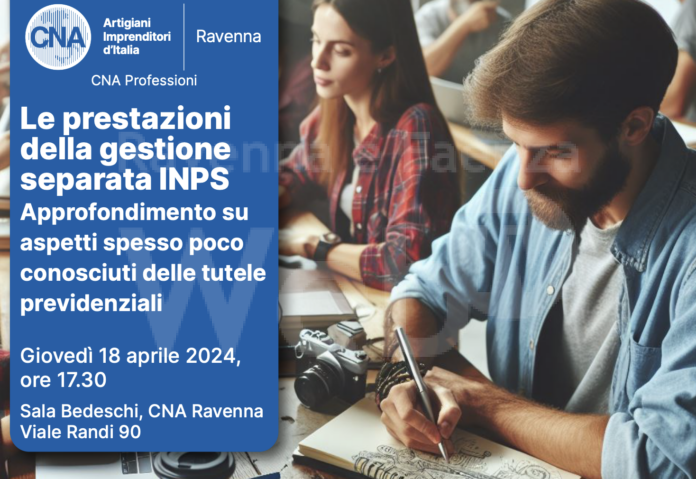 Il 18 aprile 2024 alle ore 17.30 si terrà presso la CNA di Ravenna (Viale Randi 90) un evento sulle prestazioni offerte dalla Gestione Separata dell’INPS, un momento formativo e anche conviviale rivolto principalmente a coloro che svolgono già un’attività professionale ma anche a chi sta pensando di avviarla.