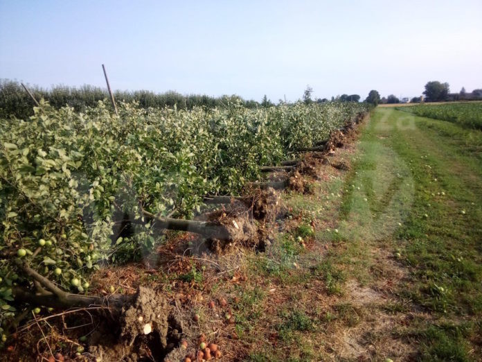 A seguito di sopralluogo e sulla base delle informazioni che arrivano dai soci di Coldiretti colpiti da questi eventi, i danni in campo dovrebbero ammontare a centinaia di migliaia di euro con frutteti spezzati, ettari di vigneti completamente piegati, frutti che si stavano avviando a maturazione (pesche tardive, pere, mele) finiti a terra, ma anche interi appezzamenti di orticole, comprese zucche, meloni e cocomeri, annientati dalla forza distruttiva del vento. L’ennesimo fenomeno calamitoso ha inoltre divelto serre, spazzato via capannoni, anche in muratura, danneggiato macchinari agricoli, dando di fatto il colpo di grazia a frutteti e orti già ridotti ai minimi termini ed a colture che in alcuni casi erano state riseminate o ritrapiantate a seguito dei danni provocati da gelo e alluvione.