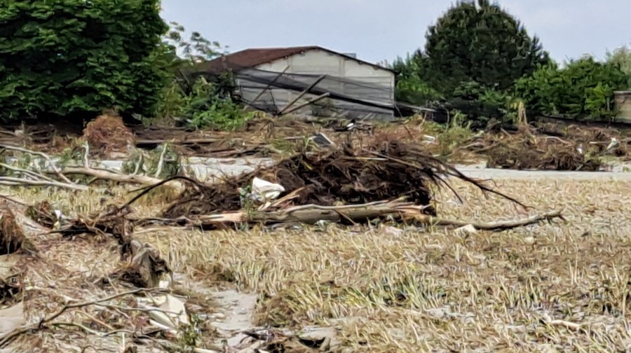 “Metri di fango, sabbia e tonnellate di legname, interi alberi, detriti, ma anche pneumatici e rifiuti. Questo è quello che gli agricoltori dei territori colpiti dalle esondazioni stanno trovando tra i frutteti e vigneti e su ciò che resta dei campi di mais che si estendono lì dove la furia dell’acqua, rotti gli argini, si è abbattuta. Da Bagnacavallo a Conselice, il paesaggio è a dir poco sconfortante ed è il medesimo: chilometri di campagne ridotte in paludi fangose nella quali si stanno arenando uno dopo l’altro i trattori degli imprenditori di queste zone che per tentare di salvare quel poco di raccolto (forse) non ancora compromesso hanno provato a lavorare i terreni rimanendo invischiati tra melma e fanghiglia.