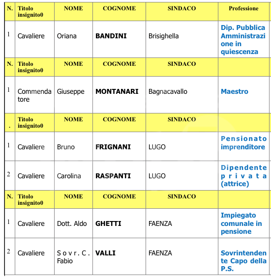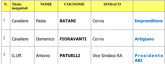 Il Prefetto Enrico Caterino, nell’arco di questi tre giorni, ha consegnato l’onorificenza di Cavaliere a 23 cittadini residenti nel ravennate, 3 onorificenze di Ufficiale al merito della Repubblica Italiana, 1 Grand Ufficiale e 1 Commendatore.