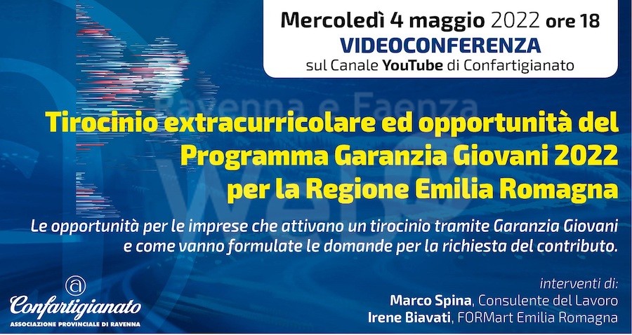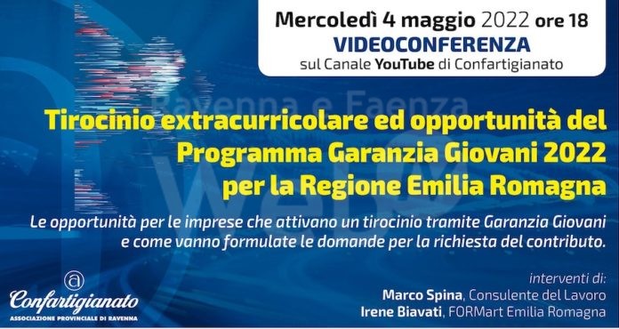 Confartigianato della provincia di Ravenna dedica una breve videoconferenza di approfondimento, sul proprio canale YouTube, alla presentazione delle opportunità per le imprese che attivano un tirocinio tramite Garanzia Giovani, e su come vanno formulate le domande per la richiesta del contributo.