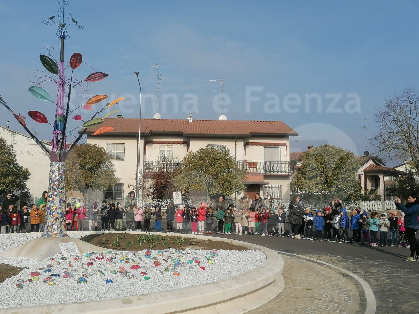 Nel 1999 l’Onu, proprio in riferimento a questo episodio, decretò la Giornata per l’eliminazione della violenza sulle donne. Ai piedi dell’albero in un settore della rotatoria sono stati collocati i sassi colorati realizzati dai bimbi, dai genitori e dalle insegnanti della scuola dell’infanzia sui temi della pace, dell’amicizia, dell’amore e dell’intercultura; nel settore opposto invece sono collocati dei fiori molto particolari in ferro e bottoni dorati, realizzati dagli ospiti della casa protetta Ius Pascendi di Conselice. I due spazi così decorati simboleggiano il legame tra le generazioni, legame sancito dall’albero della vita.