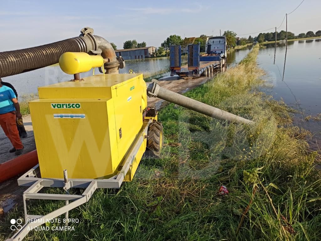 Ora c’è una situazione estremamente preoccupante nella parte più di valle, a giacitura più depressa a ridosso del fiume Reno del comprensorio consortile. L’abitato di Conselice è tuttora allagato, condizione che in alcune vie permane dallo scorso 2 maggio. Rispetto al precedente evento sono molto più estese le aree agricole inondate, da cui si cerca di far defluire l’acqua con tutti i mezzi a disposizione, compatibilmente con lo stato dei canali ricettori. Vigilato speciale è il collettore generale della rete di bonifica nel territorio compreso tra Sillaro e Santerno, che è il Canale di bonifica in destra di Reno. È un collettore della portata di circa 150 metri cubi al secondo che raccoglie le acque di pioggia (non dei fiumi) di tutto il reticolo di bonifica. Essendosi scaricati 400 milioni di metri cubi d’acqua il destra Reno è sovraccaricato oltre la sua portata di progetto, il che ha provocato una rotta in destra idraulica nei pressi di Conselice, mentre l’ente è intervenuto per favorire la laminazione del collettore in due comparti verso il Reno. Ora la priorità è alleggerire il carico idraulico del destra Reno, attraverso pompaggi dal canale nei fiumi pensili. Con l’insieme di tutti i gruppi in azione si cerca di sottrarre al collettore un decimo della sua portata nel tratto iniziale. Attraverso queste operazioni si cerca di ottenere un abbassamento di pochi cm della quota d’acqua nel collettore, che consenta di evitare altre rotte ed esondazioni. Con i gruppi di pompaggio mobili forniti tramite l’unità di coordinamento dei consorzi di bonifica emiliano-romagnoli si riesce attualmente ad avere una capacità di pompaggio complessiva 10 volte superiore a quella degli impianti idrovori stabili, più o meno nello stesso rapporto tra portata dei corsi d’acqua naturali che uscendo dagli alvei ha invaso il bacino di bonifica e portata dei canali artificiali.