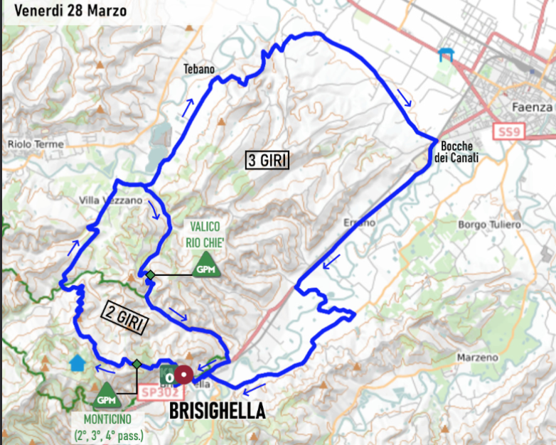Si segnala inoltre che, il giorno 28 marzo dalle ore 12.00 alle ore 15.45 circa, la SP 23 (Viale Pascoli, via Rontana e via Calbane), nel tratto compreso tra il centro urbano di Brisighella e l’intersezione con la SP 78 (via Lame), sarà percorribile solo in direzione Brisighella-Riolo Terme nei momenti tra un passaggio e l’altro dei ciclisti, nelle finestre temporali tra i passaggi della carovana di gara.