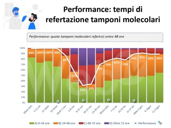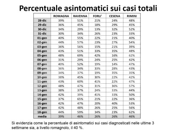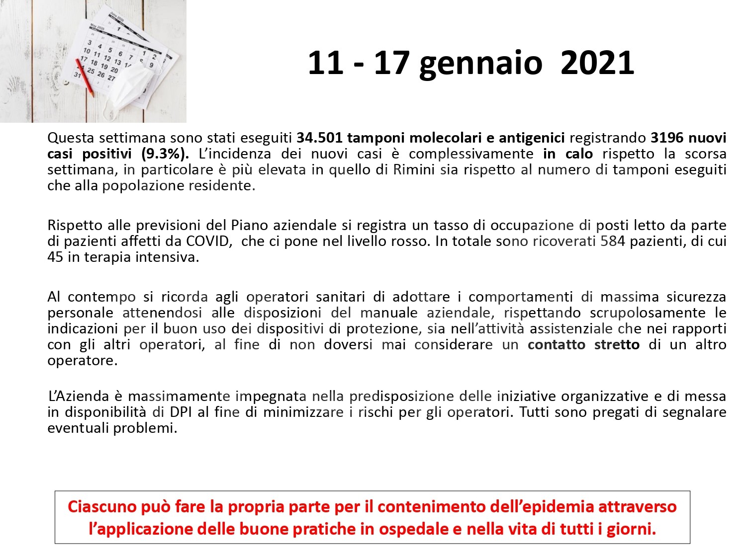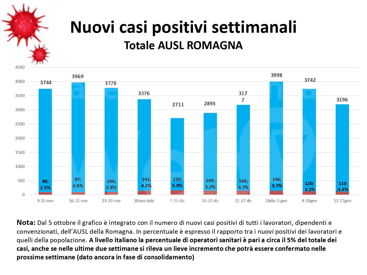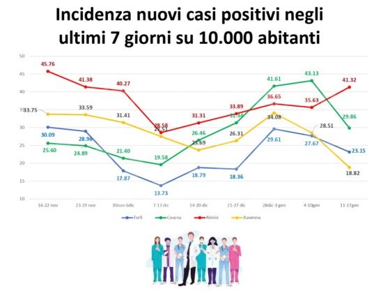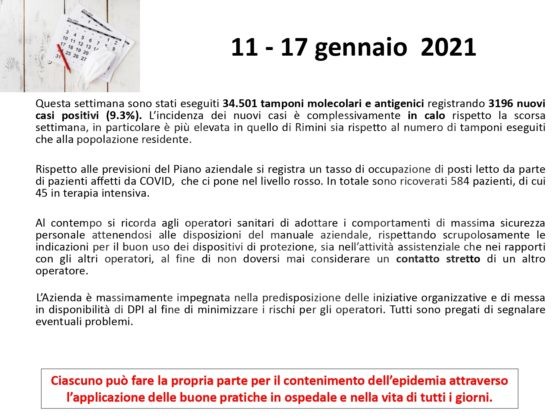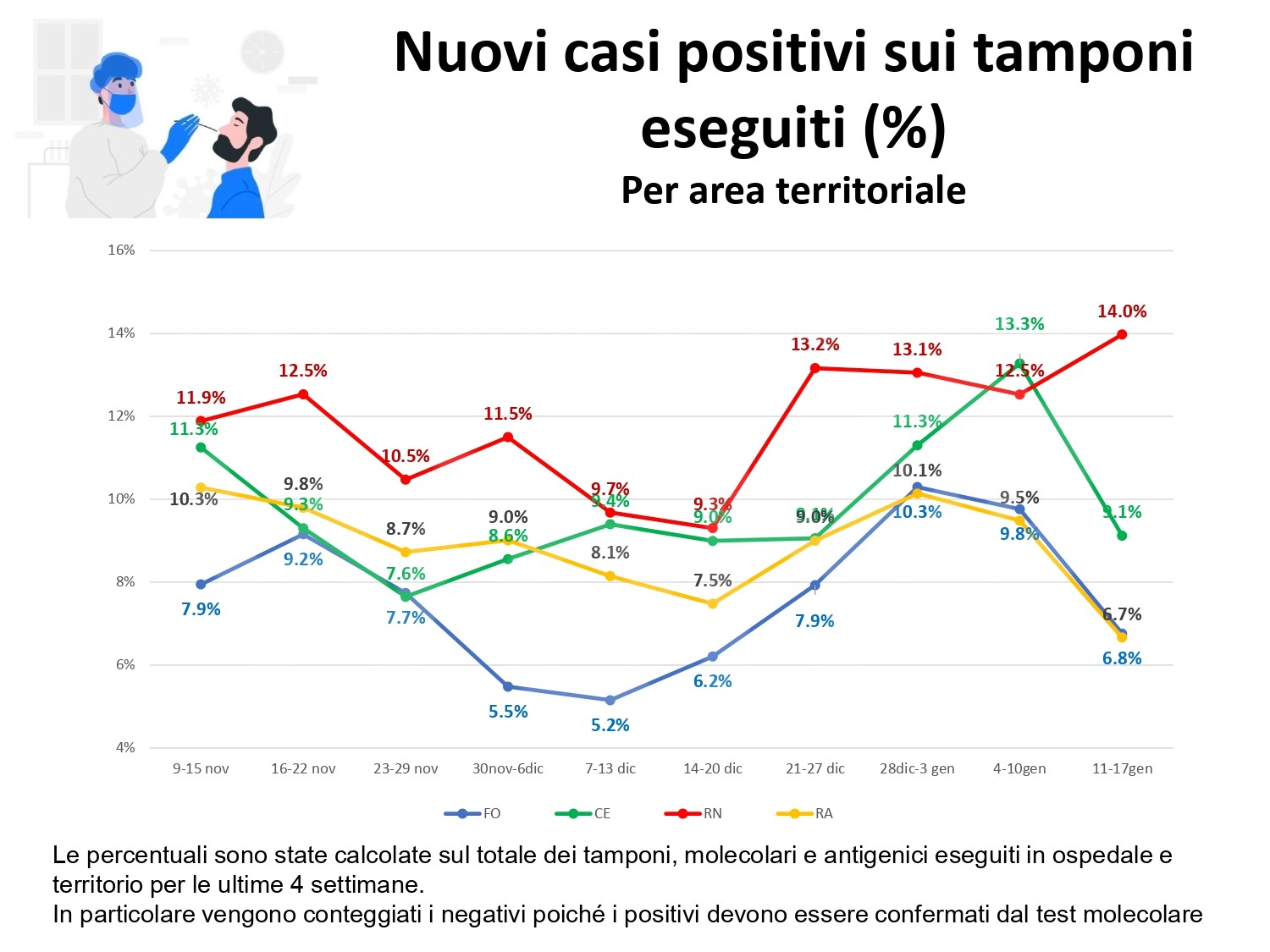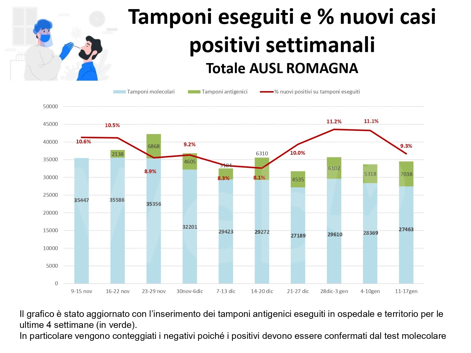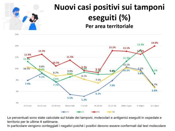 Al fine di fornire un aggiornamento rispetto all’evoluzione del quadro epidemiologico dell’infezione da covid 19 nel territorio romagnolo, su un arco temporale più significativo rispetto alla situazione di una singola giornata, si riportano, in allegato, alcuni dati relativi alla settimana dal 11 al 17 gennaio (precisando che si tratta dei casi di residenti diagnosticati sul territorio romagnolo). Nella settimana di riferimento si sono verificate 3.196 positività su un totale di 34.501 tamponi, con una incidenza dunque del 9,3 per cento, e quindi con un calo di quasi 2 punti percentuali rispetto alla settimana precedente ed un calo di 800 casi di nuove positività nel corso della settimana, rispetto al dato registrato due settimane fa; l’incidenza inoltre resta al di sotto della media nazionale (slide 4). Su questo specifico indicatore si registra, nell’ultima settimana, un calo in tutti i territori salvo Rimini, che aumenta di un punto e mezzo; medesimo trend si riscontra quanto all’indicatore delle positività su popolazione residente , ma Rimini e Ravenna hanno le percentuali di nuovi diagnosticati asintomatici più alte: 46 per cento contro la media romagnola del 39 per cento, . La performance dei tempi di refertazione dei tamponi entro le 48 ore è stabile sull’89 per cento.