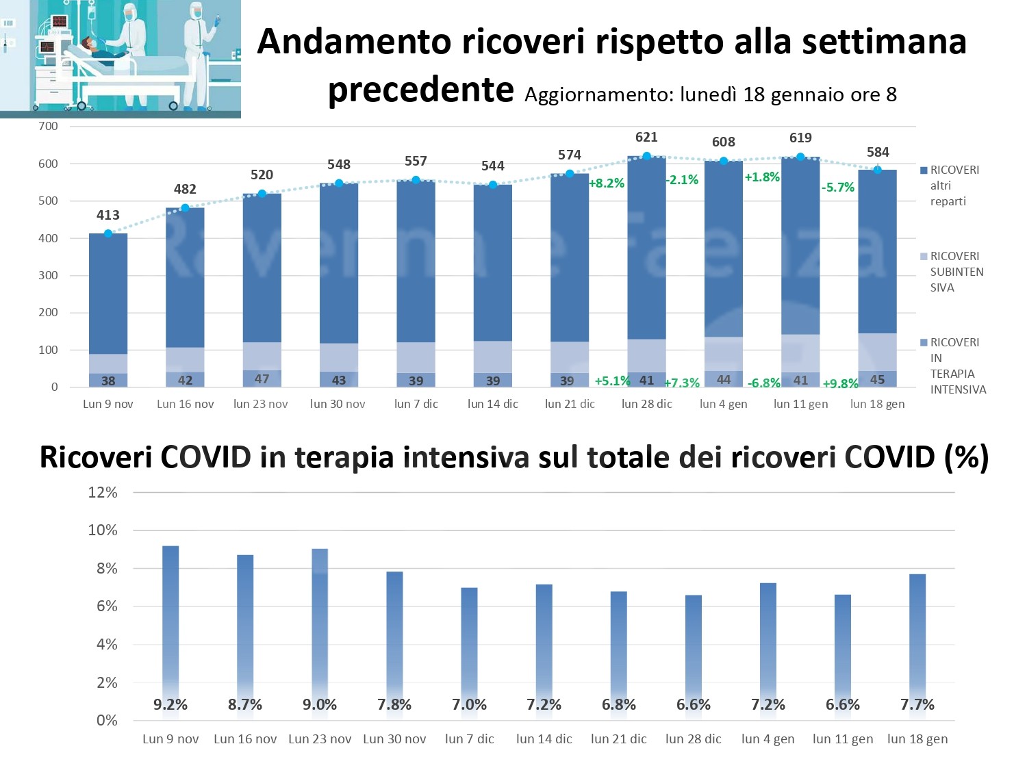 Per quanto riguarda l’indicatore relativo alle persone ricoverate, su tutta la Romagna a fine della scorsa settimana la quota di 584 ricoveri, pur mantenendo l’azienda oltre il livello rosso del Piano ospedaliero Covid, riporta questo indicatore al livello dell’ultima decade di dicembre, con un calo di 35 ricoverati rispetto alla settimana scorsa; si mantengono stabili da novembre i riempimenti nelle terapie intensive (range 37-45), la percentuale dei ricoverati in terapia intensiva resta comunque inferiore a quella media regionale. “Questi dati positivi certo ci fanno piacere, ma non devono in alcun modo farci deflettere dal massimo impegno, nei nostri quotidiani comportamenti, rispetto al mantenimento di quelle che sono le linee guida per la sicurezza sul covid – mette in guardia il direttore sanitario dell’Ausl Romagna Mattia Altini -, e conseguentemente, nonostante l’inizio delle vaccinazioni, resta indispensabile mantenere altissima la guardia e rispettare le linee guida relative alle pratiche per cercare di limitare il rischio di contagio. Fortunatamente sono in calo anche i dati dei ricoveri ma dobbiamo rientrare entro livelli più contenuti per svolgere con ancor più slancio e risorse l’attività ordinaria. Quindi massima attenzione da parte di tutti, per cercare di capitalizzare questi risultati ed evitare che al contrario gli indicatori tornino a salire: dipende solo da noi. In attesa della vaccinazione, cerchiamo il più possibile di limitare i danni”.