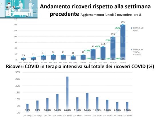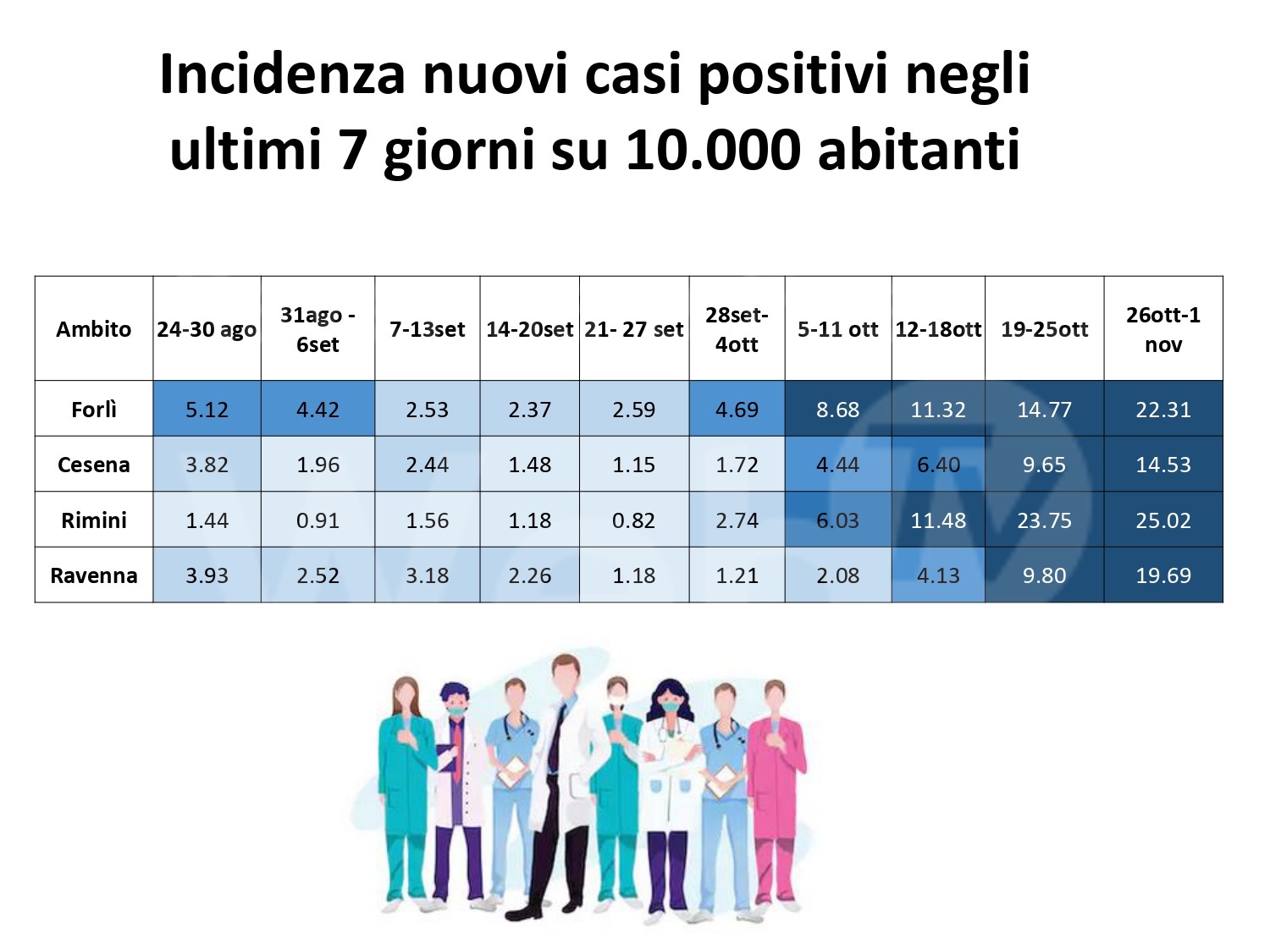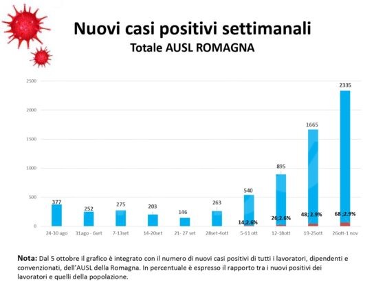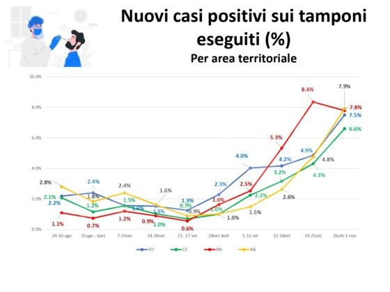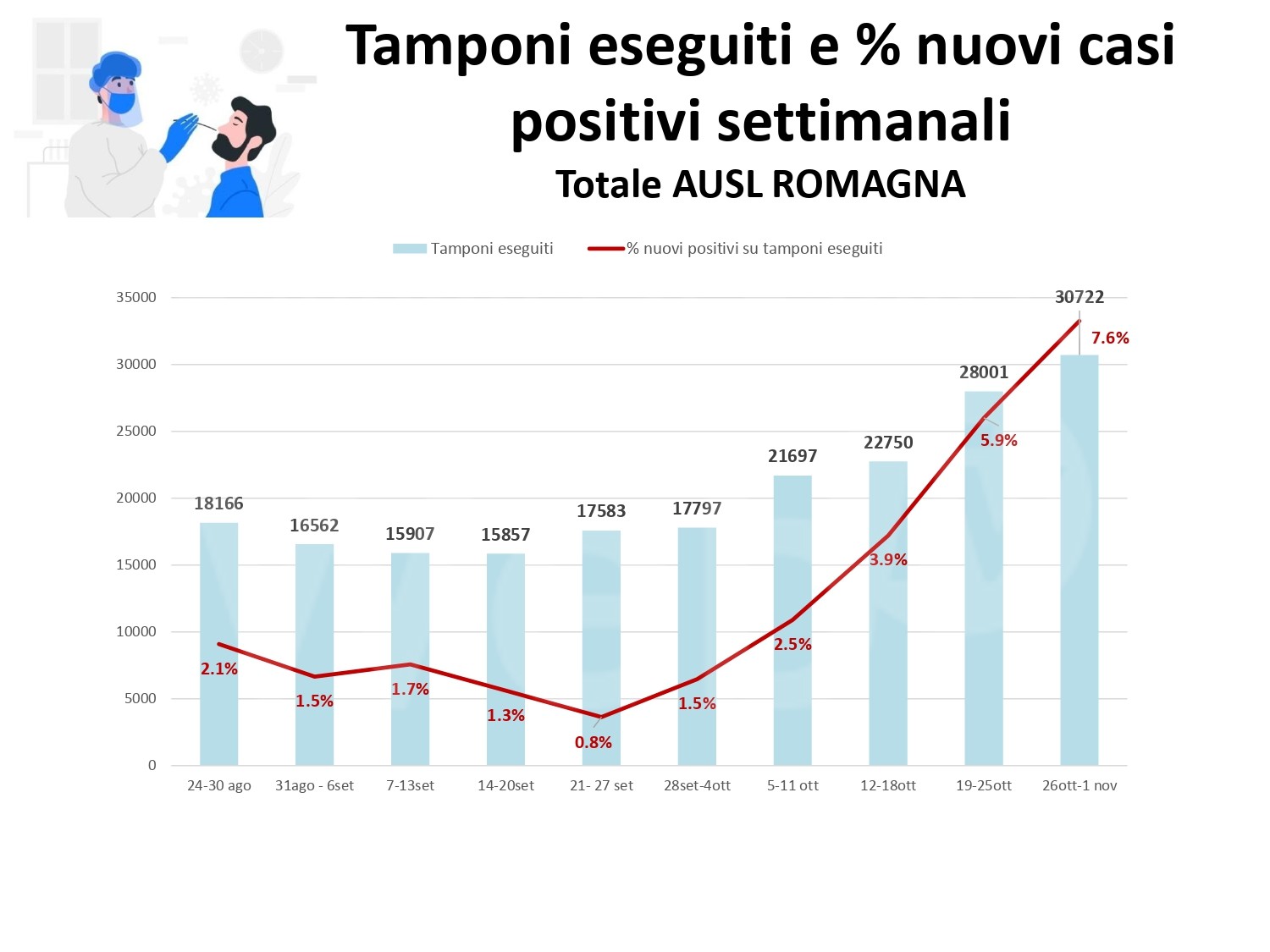 Al fine di fornire un aggiornamento rispetto all’evoluzione del quadro epidemiologico dell’infezione da covid 19 nel territorio romagnolo, su un arco temporale più significativo rispetto alla situazione di una singola giornata, si riportano, in allegato, alcuni dati relativi alla settimana dal 26 ottobre al primo novembre (precisando che si tratta dei casi di residenti diagnosticati sul territorio romagnolo).