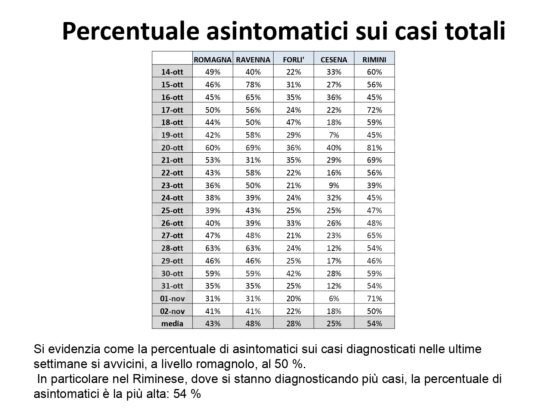 Su questo dato si registra, nell’ultima settimana, tra i vari territori della Romagna, un riallineamento: le province di Rimini e di Ravenna hanno dato pressochè analogo, i territori di Forlì e soprattutto Cesena hanno incidenze leggermente più basse. Restano invece maggiori differenze rispetto all’indicatore delle positività su popolazione residente, con Rimini e Forlì con dati più alti, così come sulle percentuali di asintomatici: il territorio romagnolo si attesta sul 43 per cento con Ravenna e soprattutto Rimini con percentuali superiori di persone positive ma senza sintomi.
