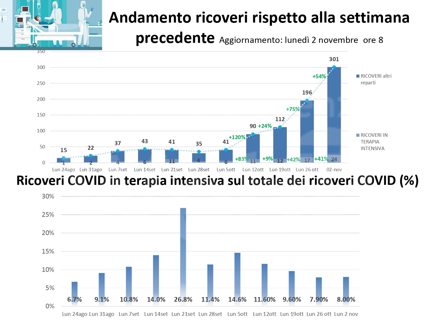 Per quanto riguarda l’occupazione dei posti letto, nella settimana di riferimento si è verificato un aumento, in questo caso omogeneo tra i vari territori, di malati nei reparti di degenza. Resta di fatto stabile l’incidenza di ricoveri in terapia intensiva sul totale dei ricoverati.