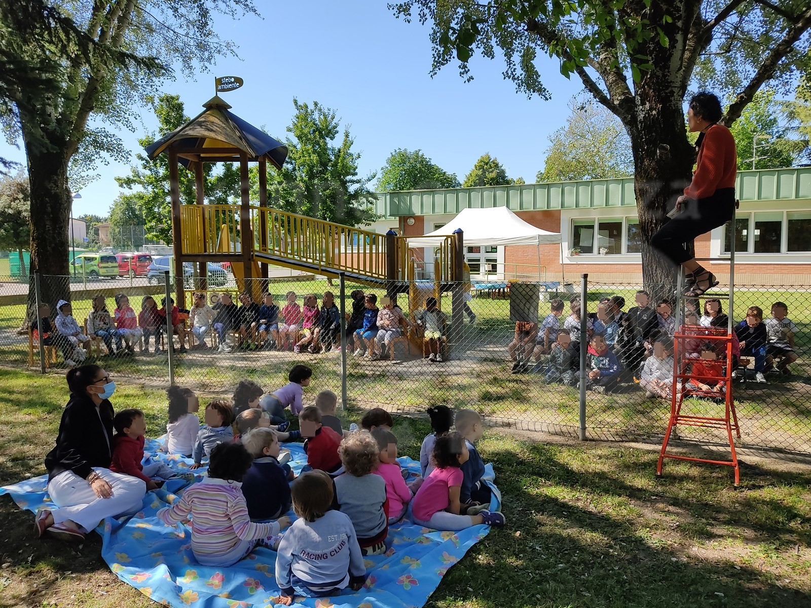 I bambini e le bambine del nido hanno così potuto incontrare i compagni più grandi della scuola dell’infanzia e le loro insegnanti, un incontro che ha proiettato i più piccoli nell’importante passaggio del prossimo anno scolastico. Il progetto si concluderà con un pranzo all’aperto nei rispettivi giardini, in un momento di festa, divisi ma vicini.