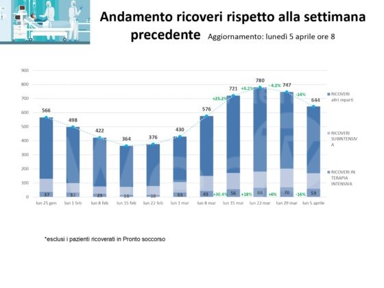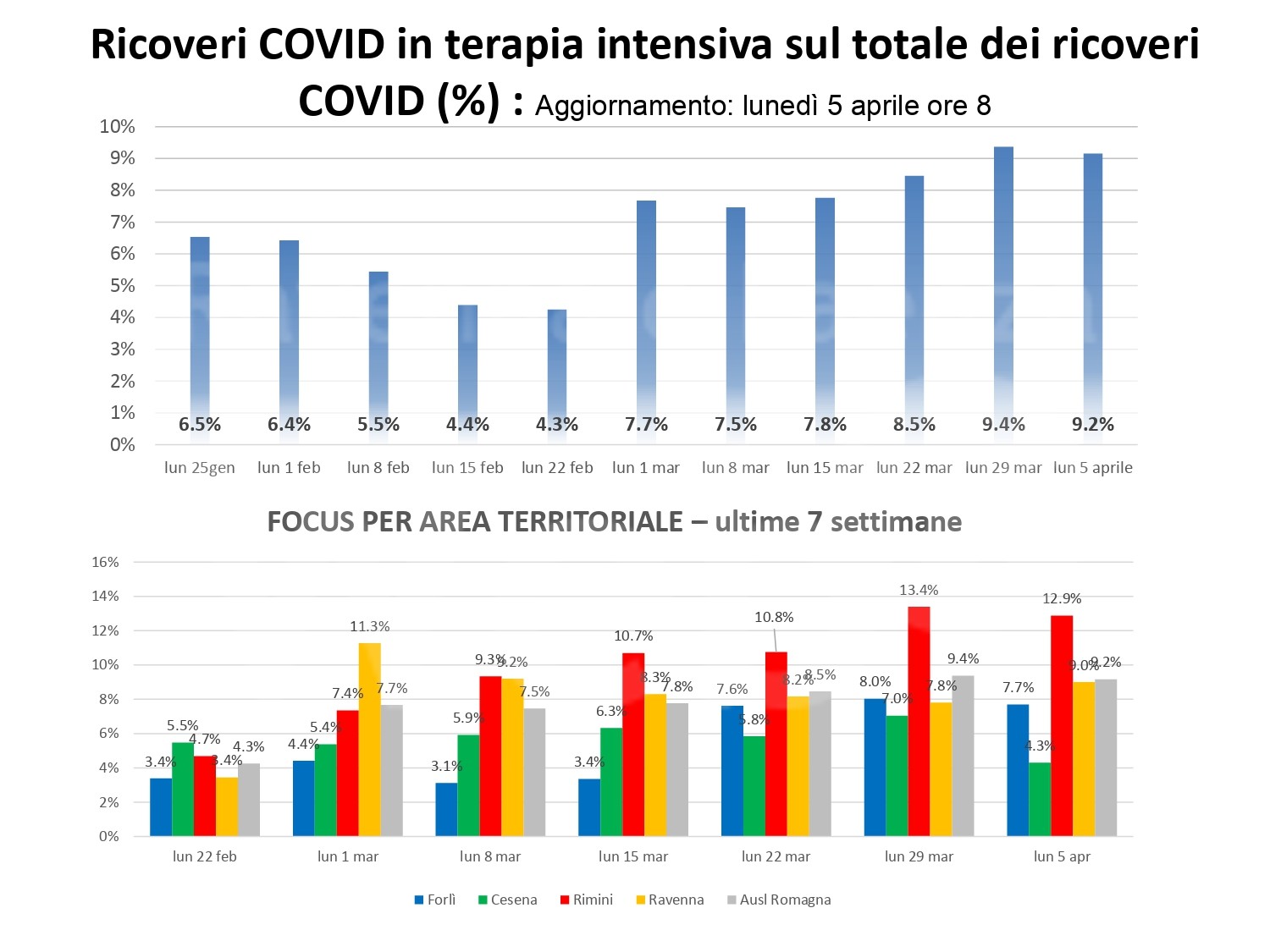 Per quanto riguarda l’indicatore relativo alle persone ricoverate, su tutta la Romagna, a lunedì 5 aprile, si registra la quota di 644 ricoveri, con una diminuzione di 103 ricoverati rispetto alla settimana precedente, pur rimanendo l’azienda all’interno del livello rosso del Piano ospedaliero Covid; anche i riempimenti nelle terapie intensive sono in calo, sia in termini assoluti che percentuali.