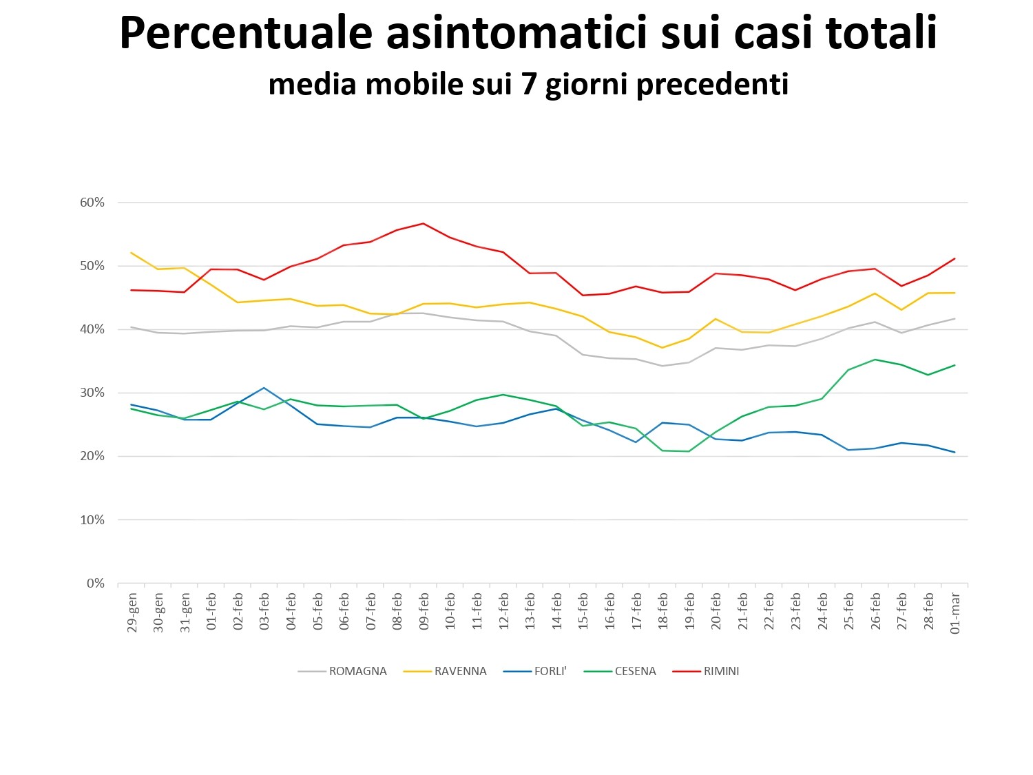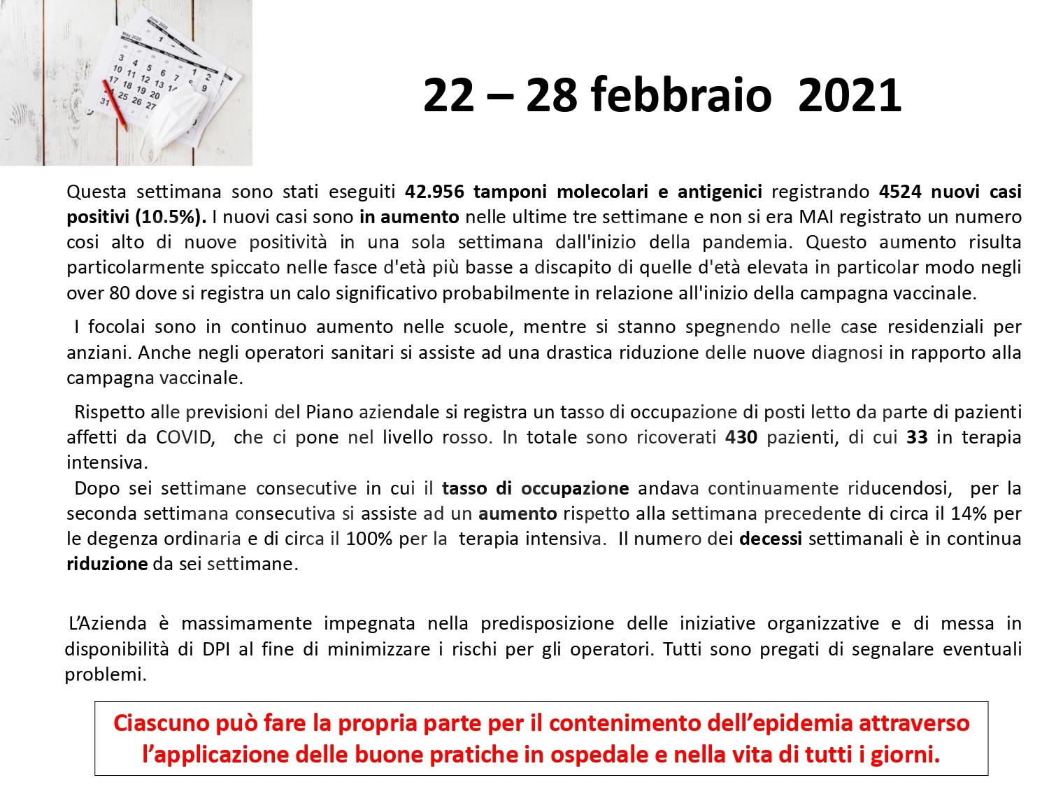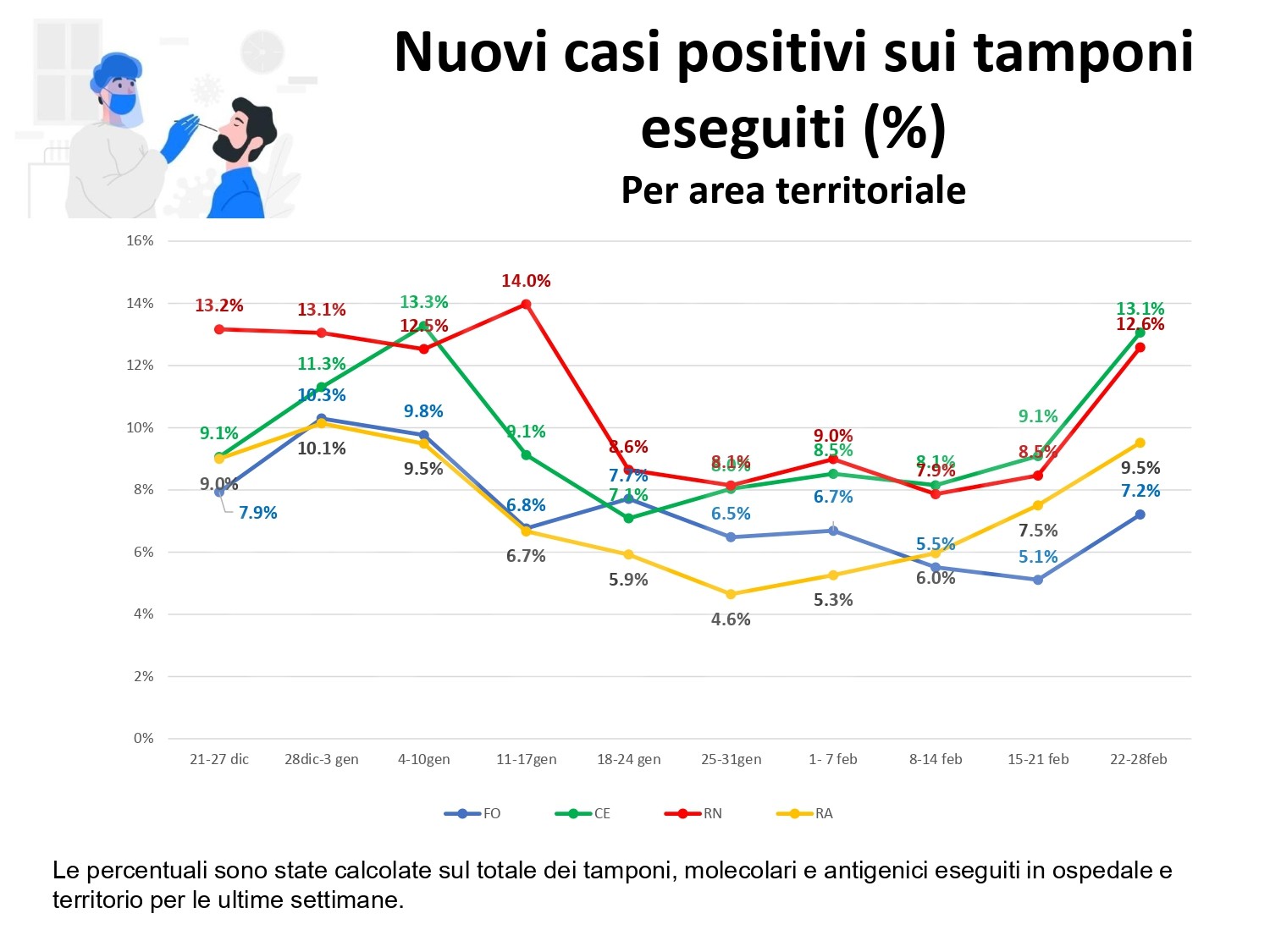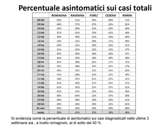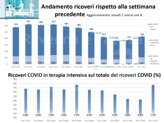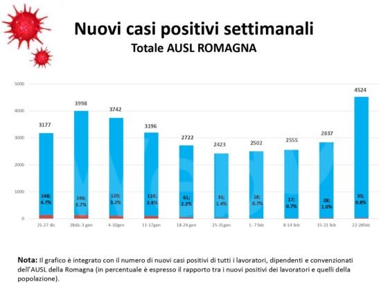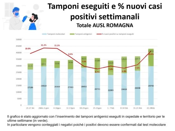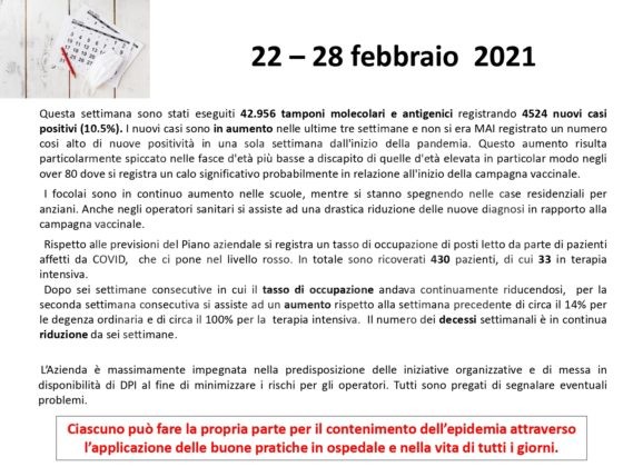Al fine di fornire un aggiornamento rispetto all’evoluzione del quadro epidemiologico dell’infezione da Covid 19 nel territorio romagnolo, su un arco temporale più significativo rispetto alla situazione di una singola giornata, si riportano, in allegato, alcuni dati relativi alla settimana dal 22 al 28 febbraio (precisando che si tratta dei casi di residenti diagnosticati sul territorio romagnolo). Nella settimana di riferimento, si sono verificate 4.524 positività su un totale di 42.956 tamponi eseguiti; si osserva quindi un tasso di positività del 10,5 per cento, evidenziando, in questa settimana, un trend di crescita dei nuovi casi positivi, nel territorio romagnolo. La performance dei tempi di refertazione dei tamponi, entro le 48 ore, si mantiene molto alta, registrando il 99 per cento. Per quanto riguarda l’indicatore relativo alle persone ricoverate, su tutta la Romagna, a lunedì 1 marzo, si registra la quota di 430 ricoveri, con un rialzo di 54 ricoverati rispetto alla settimana scorsa, mantenendo l’azienda all’interno del livello rosso del Piano ospedaliero Covid.