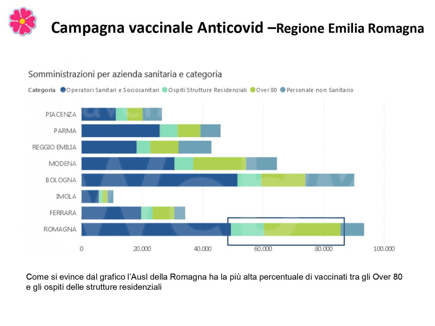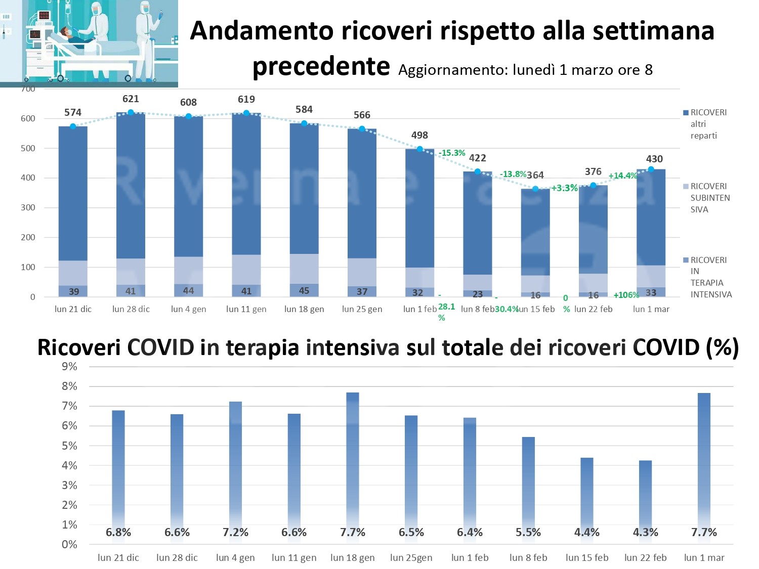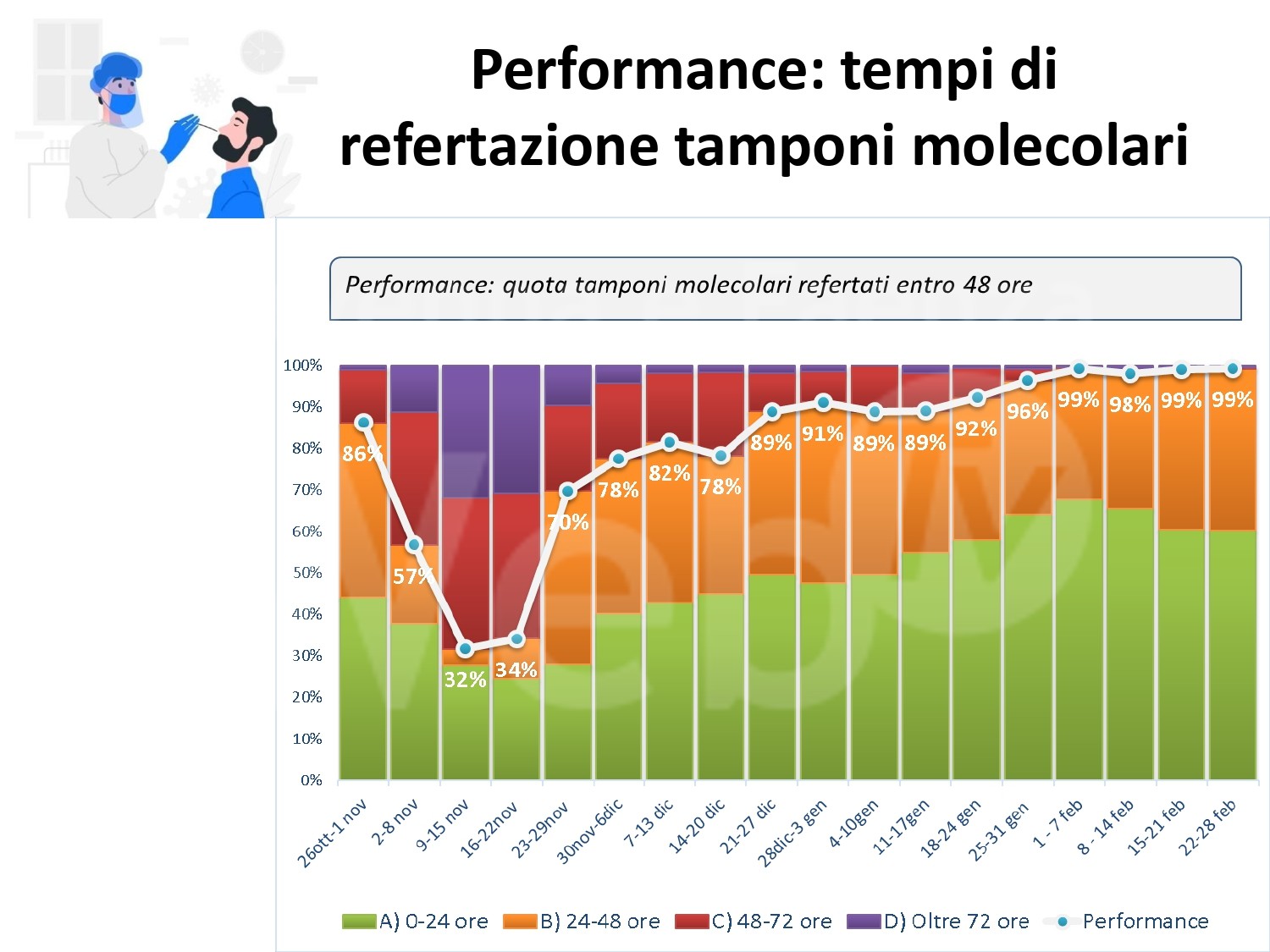 Al fine di fornire un aggiornamento rispetto all’evoluzione del quadro epidemiologico dell’infezione da Covid 19 nel territorio romagnolo, su un arco temporale più significativo rispetto alla situazione di una singola giornata, si riportano, in allegato, alcuni dati relativi alla settimana dal 22 al 28 febbraio (precisando che si tratta dei casi di residenti diagnosticati sul territorio romagnolo). Nella settimana di riferimento, si sono verificate 4.524 positività su un totale di 42.956 tamponi eseguiti; si osserva quindi un tasso di positività del 10,5 per cento, evidenziando, in questa settimana, un trend di crescita dei nuovi casi positivi, nel territorio romagnolo. La performance dei tempi di refertazione dei tamponi, entro le 48 ore, si mantiene molto alta, registrando il 99 per cento. Per quanto riguarda l’indicatore relativo alle persone ricoverate, su tutta la Romagna, a lunedì 1 marzo, si registra la quota di 430 ricoveri, con un rialzo di 54 ricoverati rispetto alla settimana scorsa, mantenendo l’azienda all’interno del livello rosso del Piano ospedaliero Covid.