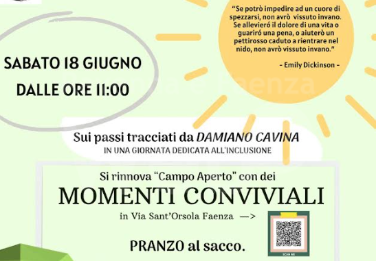 Momenti Conviviali al Campo Aperto di via Sant’Orsola, a Faenza, per conoscere le diverse comunità del territorio. Sabato 18 giugno, alle 11, l’associazione Axat organizza un momento di inclusione ideato pensando al cibo. Un pranzo al sacco durante il quale si incontreranno le comunità di Faenza, le associazioni del territorio e tutti i cittadini che vorranno partecipare. La giornata è dedicata alla memoria di Damiano Cavina, al suo impegno per far incontrare e conoscere le comunità straniere che risiedono nel faentino.