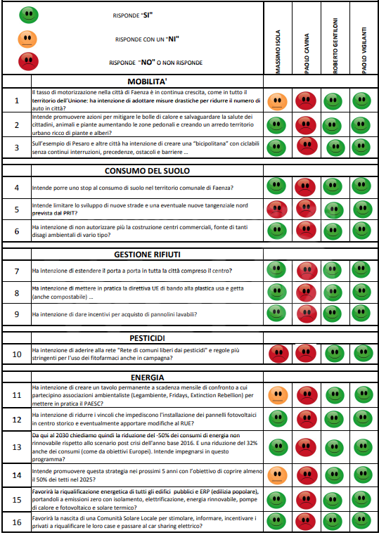 MASSIMO ISOLA (Centro Sinistra): le risposte del candidato ci sembra che seguano una linea troppo cauta non all’altezza dell’emergenza climatica in atto. Ci saremo aspettati da un candidato che usa come slogan “UN NUOVO INIZIO” scelte più decise e coraggiose. Purtroppo ci delude nei temi del traffico, è favorevole alla nuova tangenziale, delude anche nel tema dei pesticidi, temi fondamentali per la riduzione delle fonti energetiche fossili. (Ricordiamo che i pesticidi necessitano un consumo e spreco di quantità di energie fossili enormi). Buone invece le promesse sul campo della riduzione rifiuti, e lo stop a nuovi centri commerciali.