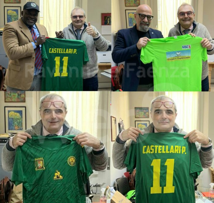 L’occasione è stata gradita al presidente della Onlus Il Terzo Mondo ODV Charles Tchameni Tchienga, per offrire al Notaio faentino Paolo Castellari la maglia ufficiale della nazionale di calcio del Camerun ovvero dei leoni indomabili, attualmente impegnati in Costa d’Avorio per la Coppa d’Africa delle Nazioni.