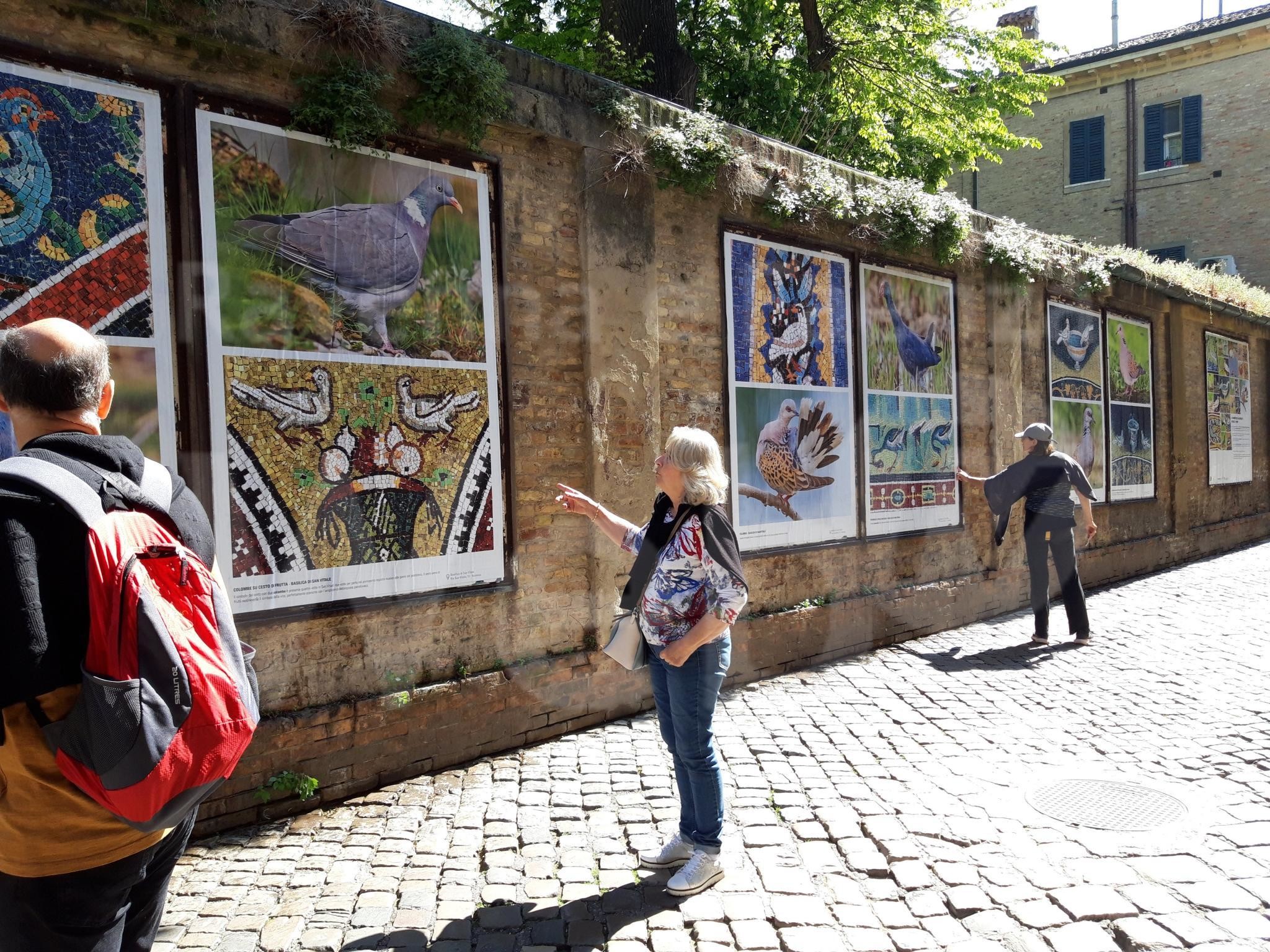 Nella mostra gli uccelli riprodotti a mosaico sono quelli del nucleo di copie di mosaici antichi eseguite dal Gruppo Mosaicisti di Ravenna negli anni ’50 del secolo scorso, oggi anch’essi opere d’arte. Le immagini fotografiche sono fornite dal Parco del Delta del Po e sono state realizzate da Maurizio Bonora, Massimiliano Costa, Nicola Merloni, Luciano Piazza e Roberto Zaffi.
