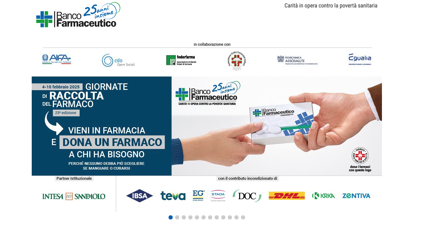 Un doppio anniversario, quello che si celebra quest’anno: ricorrono infatti il 25mo del Banco Farmaceutico e la 25ma edizione delle Giornate di Raccolta del Farmaco. Da martedì 4 a giovedì 10 febbraio saranno oltre 5.800 le farmacie in tutta Italia che parteciperanno all’iniziativa, riconoscibili dalla locandina esposta all’ingresso (l’elenco completo delle farmacie aderenti è disponibile da martedì 4 sul sito www.bancofarmaceutico.org), nelle quali i cittadini potranno scegliere di donare uno o più medicinali da banco per i bisognosi.