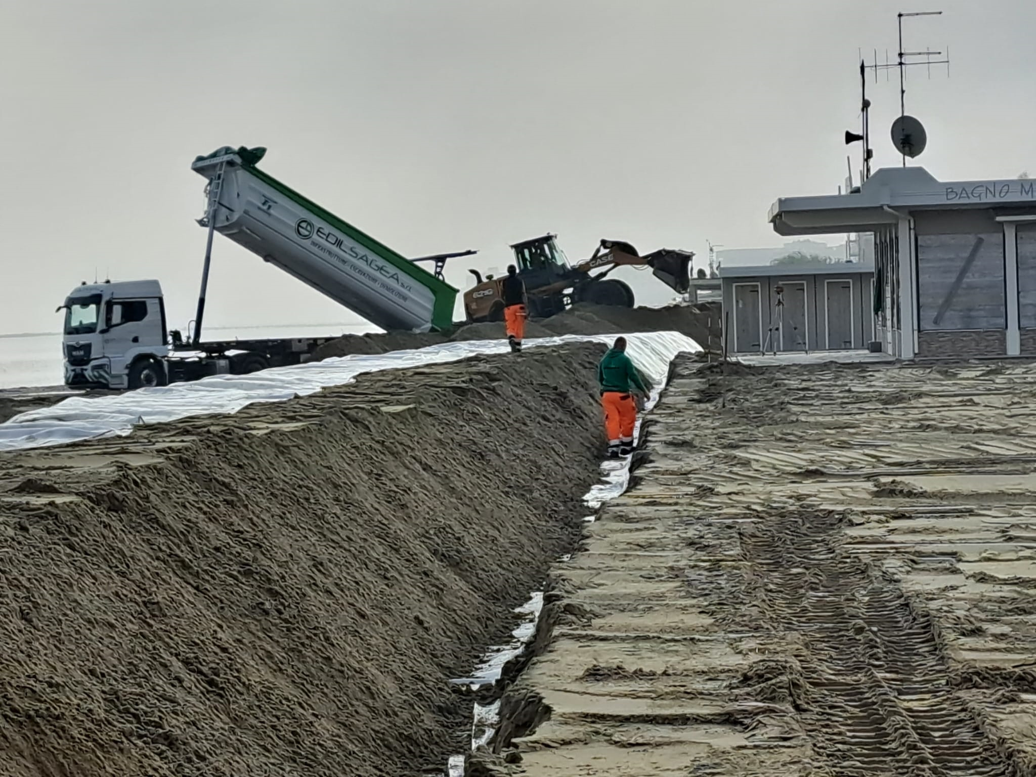 I lavori hanno visto la realizzazione di due dune invernali con un nucleo interno in sabbia, protetto da un telo geotessile di rinforzo, in fibre di poliestere. A completamento delle opere, caratterizzate da pendenze molto dolci nel lato verso mare, il nucleo è stato ricoperto da uno strato di sabbia. In questo modo viene favorito il naturale flusso e riflusso dell’acqua durante le mareggiate, minimizzando al tempo stesso l’effetto erosivo di scalzamento al piede dell’argine.