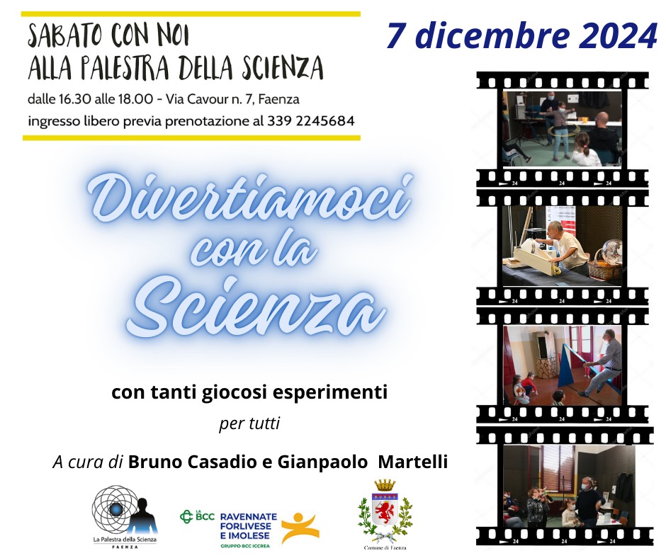 Il prossimo 7 dicembre, nell’ambito della rassegna “Sabato con Noi – 2024” alla Palestra della Scienza, in via Cavour 7, Faenza, dalle 16.30 alle 18.00, verrà recuperato l’incontro dal tema “Divertiamoci con la Scienza con tanti giocosi esperimenti”, idoneo alla partecipazione di tutti. L’incontro sarà a cura di Bruno Casadio e Gianpaolo Martelli.