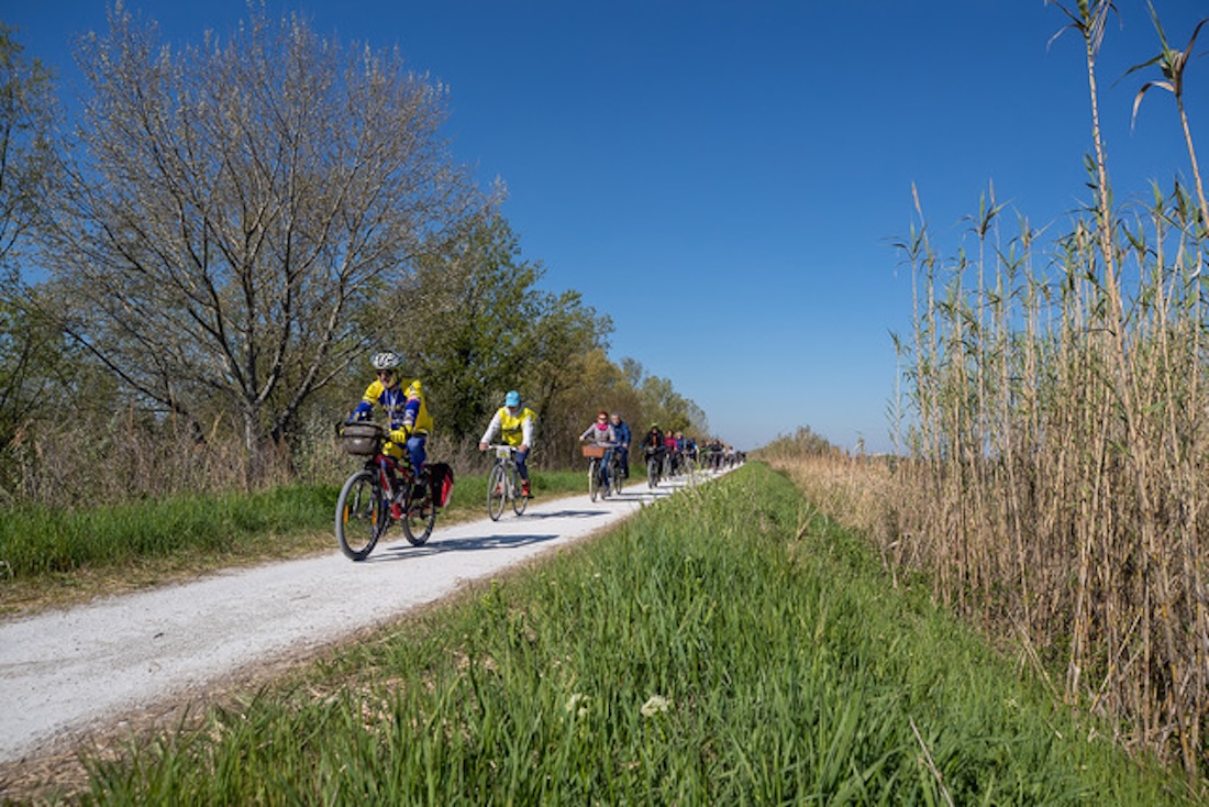 Domenica 22 giugno dallo Chalet dei Giardini Pubblici alle ore 10 parte la pedalata “argini in bicicletta”, condotto dagli studiosi Osiride Guerrini e Giovanni Fanti. Il percorso di 26 km è disegnato nel triangolo iscritto tra i fiumi Montone e Ronco, che vede il vertice a Punta Galletti, a ridosso del centro di Ravenna, un fazzoletto di terra ricco di testimonianze storiche e teatro della sanguinosa battaglia di Ravenna. L’evento è compreso nella rassegna Storie di Fiume, una lunga serie di attività disseminate lungo il corso del Ronco-Bidente, dalla sorgente alla foce, che hanno come fine ultimo quello di contribuire alla conoscenza del tessuto idrogeologico, passo obbligatorio nella ricostruzione del rapporto uomo-fiume profondamente deteriorato dalle vicende catastrofiche del recente passato. La scelta delle due ruote è dettata dal fatto che la gran parte del territorio compreso nel percorso è stato costruito dall’uomo, in particolare dagli scariolanti che utilizzavano quotidianamente le biciclette, portando con sé gli strumenti del mestiere. Bicicletta che oggi consente al turista curioso di partire dalle mura della città per esplorarne palmo palmo i dintorni osservando il territorio. È quello che faremo dalla posizione privilegiata della sommità arginale, dove lo sguardo spazia sulle campagne coltivate, caseggiati, ville antiche, campanili e piccole zone boscose, raccontando storie di chiuse, canali, cammini, partigiani, ponti, antiche famiglie e cruenti battaglie.