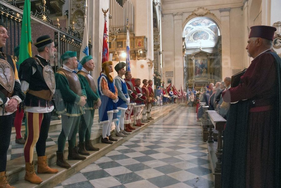 Ogni delegazione rionale sarà composta da un tamburino, due sbandieratori, un portacero, due figure maschili, un portagonfalone, due armati e il Capo Rione. Il Gruppo Municipale sarà composto invece da cinque chiarine, cinque tamburini, un portagonfalone, un portacero, il reggente del Gruppo Municipale, il Podestà della Giostra, un notabile, quattro armati, tre rotellini e il Maestro di Campo. All’Offertorio, i portacero del Gruppo Municipale e dei Rioni verranno chiamati dal Maestro di Campo e si porteranno al centro della navata centrale fino in prossimità del gruppo dei Capi Rione; in quel momento, il Capo Rione si affiancherà al proprio portacero e, insieme, offriranno all’Officiante il cero.