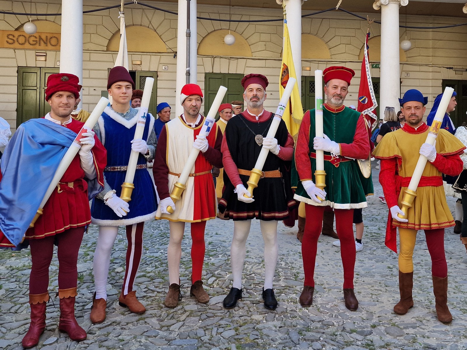 Ogni delegazione rionale sarà composta da un tamburino, due sbandieratori, un ‘porta-cero’, due figure, un ‘porta-gonfalone’, due ‘armati’, un Cavaliere giostrante e il Capo Rione. Il Gruppo Municipale sarà composto invece da tre chiarine, cinque tamburini, un ‘porta-gonfalone’, un ‘porta-cero’, il reggente del Gruppo Municipale, il Podestà della Giostra, un notabile, quattro armati, tre ‘rotellini’ e il Maestro di Campo. Anche quest’anno saranno presenti alla cerimonia cinque tra i Cavalieri che correranno le Giostre della Bigorda d’Oro e del Palio, uno per ogni Rione, che si posizioneranno nei pressi della Cappella della Beata Vergine delle Grazie. Saranno presenti: Marco Beccacece (Borgo Durbecco), Davide Ricci (Rione Giallo), Matteo Tabanelli (Rione Nero), Matteo Rivola (Rione Rosso), Daniele Ravaioli (Rione Verde).