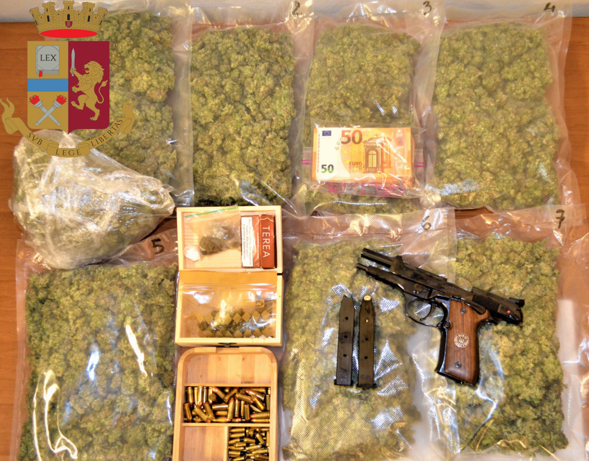 E’ stato effettuato un controllo d’iniziativa della casa che ha consentito di rinvenire, occultate in diverse stanze, oltre due kg di marijuana, cocaina, hashish, un bilancino di precisione ma, soprattutto, è stata rinvenuta sul comò della camera da letto e ben visibile una pistola semiautomatica completa di caricatore inserito con 5 proiettili all’interno, un caricatore vuoto e 50 proiettili cal. 9 x 21. Sono rinvenuti inoltre 5.000 euro in contanti che la donna ha tentato di occultare prima dell’arrivo dei poliziotti, e due orologi Rolex.