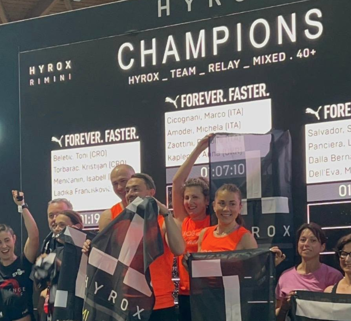 Primo posto nella categoria U40+ nella staffetta mista 2 uomini e 2 donne. Composta da Amodei Michela (che già vanta numerose vittorie nelle competizioni più importanti in Italia nel Crossfit), Cicognani Marco (già secondo all’ hyrox di Torino, nella staffetta mista ), Rodolfo Zaottini e Anna Kaplenko.