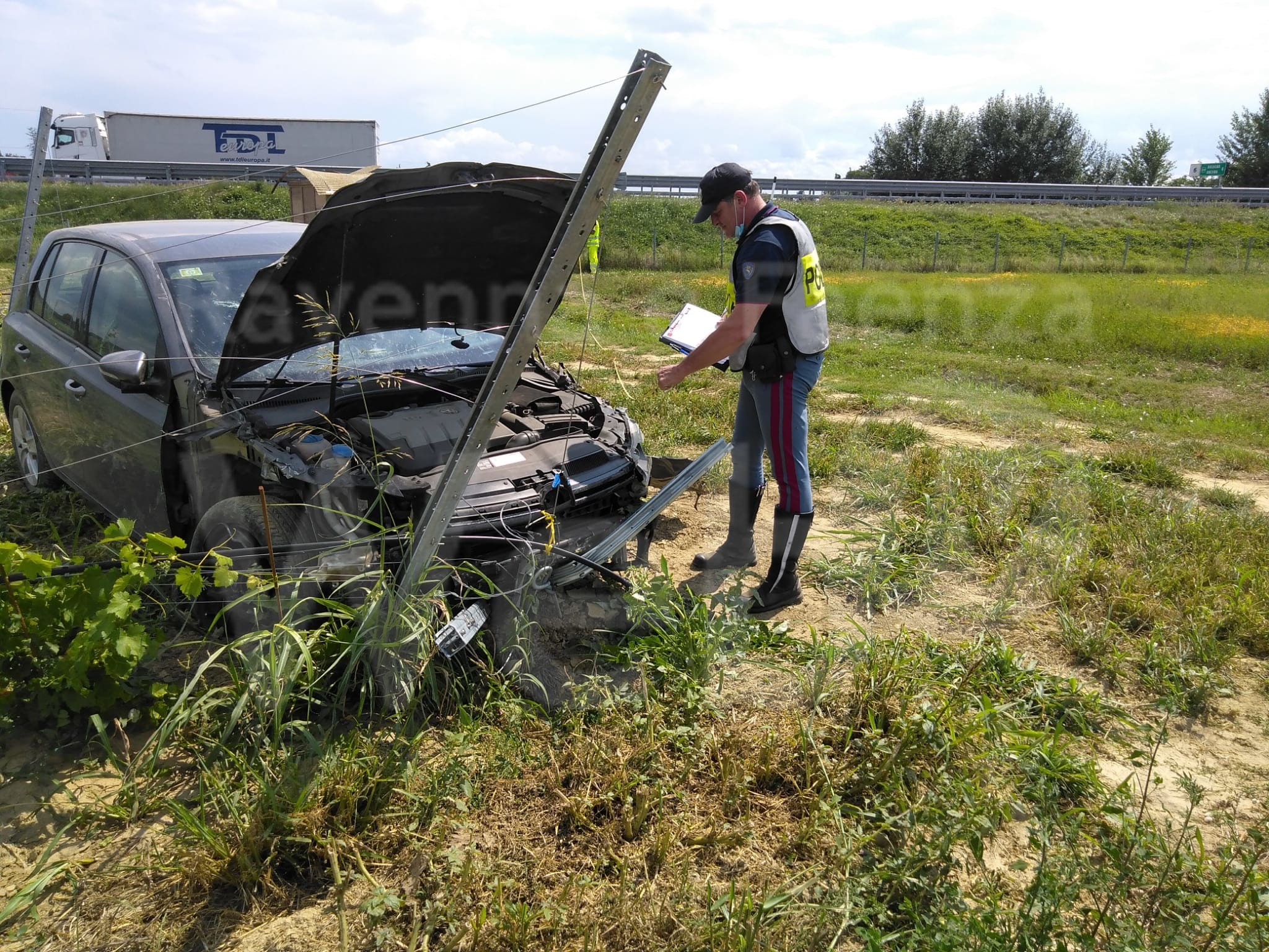 Intorno alle ore 13.30 un ragazzo e una ragazza sulla trentina si trovavano in autostrada all’altezza a bordo di Volkswagen Golf in direzione Bologna quando improvvisamente l’auto è finita fuori strada all’altezza del km 7 nord. L’auto è volata fuori dall’autostrada senza cappottare ma abbattendo diversi filari di un vigneto che costeggiavano il tratto di autostrada. Dopo circa 50 metri ha arrestato la sua corsa. Risulta illeso il conducente, mentre la ragazza è stata portata all’ospedale di Lugo con un codice 1 di bassa gravità. Sul posto, oltre a due ambulanze del 118, è intervenuta anche la Polstrada di Lugo per rilievi e per constatare la dinamica dell’incidente.