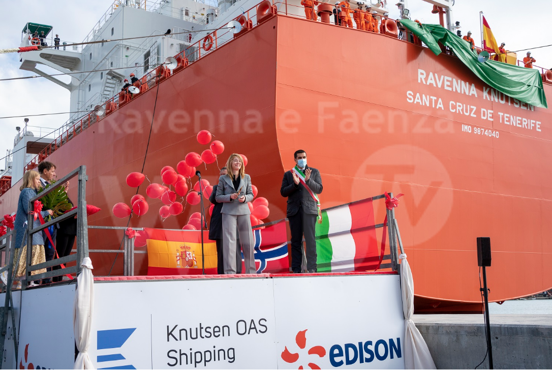 Edison e Knutsen Oas Shipping hanno tenuto la cerimonia di battesimo della nave metaniera Ravenna Knutsen che garantirà l’approvvigionamento del deposito costiero Small Scale Gnl a Ravenna, di proprietà di Depositi Italiani Gnl, Dig (51% Pir, 30% Edison, 19% Scale Gas). La nave è l’elemento cardine della prima catena logistica integrata di small scale Lng (impianti di gas naturale liquefatto su piccola scala) in Italia che Edison sta realizzando per favorire la decarbonizzazione dei trasporti marittimi e pesanti.